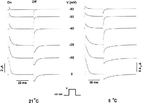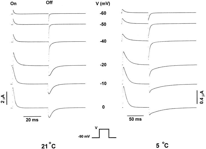 Figure 7. Temperature effects on the time course of gating currents. Unsubtracted family of gating currents from shH4ir-W434F obtained at 21 and 5°C elicited in responses to variable test pulses (V). Holding potential was −90 mV. The test pulses were 40- and 80-ms long at 21 and 5°C, respectively. Postpulses were 40- and 240-ms long at 21 and 5°C, respectively. Data obtained at 21°C was filtered at 2 kHz and digitized every 70 μs. Data obtained at 5°C was filtered at 2.5 kHz and digitized every 190 μs. Notice the large effect of temperature in the kinetics of the Off response of gating currents, particularly at depolarized potentials.