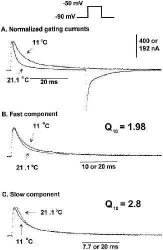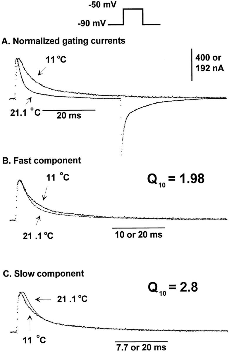 Figure 8. Kinetic behavior for the On response of gating currents obtained at −50 mV. Unsubtracted traces elicited in responses to a test pulse of −50 mV at 21.1 and 11°C. The holding potential was −90 mV. The test pulses were 40- and 80-ms long at 21.1 and 11°C, respectively. Postpulses were 160-ms long. Data obtained at 21.1°C was originally filtered at 5 kHz and digitized every 50 μs. The trace shown in the figure was digitally filtered at 2 kHz to compare with data obtained at 11°C. Data obtained at 11°C was filtered at 2 kHz and digitized every 80 μs. (A) Normalized gating currents. Traces obtained at 21.1 and 11°C normalized for the size of the peak of the On response of the gating current (multiplying by 2.08) and superimposed. (B) Fast component. Gating current trace obtained at 21.1°C multiplied by a time-expansion factor (2×) to superimpose with the first part of the gating current trace obtained at 11°C. (C) Slow component. Gating current trace obtained at 21.1°C multiplied by a time-expansion factor (2.6×) to superimpose with the second part of the gating current trace obtained at 11°C. 0 K+/0 Na+ internal and external solutions.