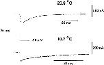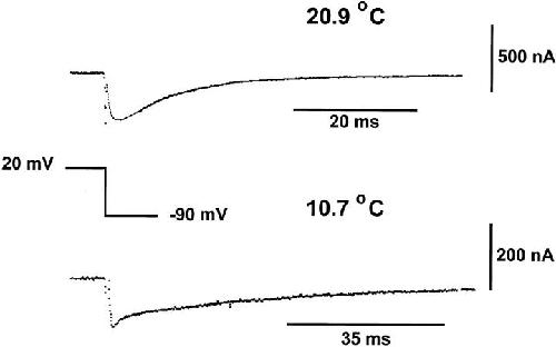 Figure 9. Time course of the Off response of gating current obtained at depolarized potentials at different temperatures. Unsubtracted Off responses traces elicited after a test pulse of 20 mV returning to −90 mV (holding potential). Traces obtained at 20.9 and 10.7°C. Gating current trace obtained at 20.9°C was originally filtered at 5 kHz and digitized every 50 μs. Trace shown in the figure was digitally filtered to 2 kHz. Gating current trace obtained at 10.7°C was filtered at 2 kHz and digitized every 80 μs. Notice that at low temperature the rising phase is lost and a faster decaying component appears.