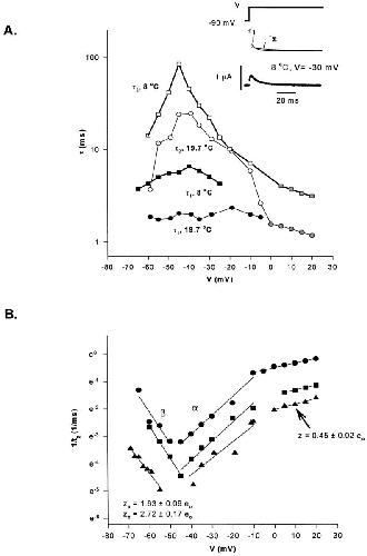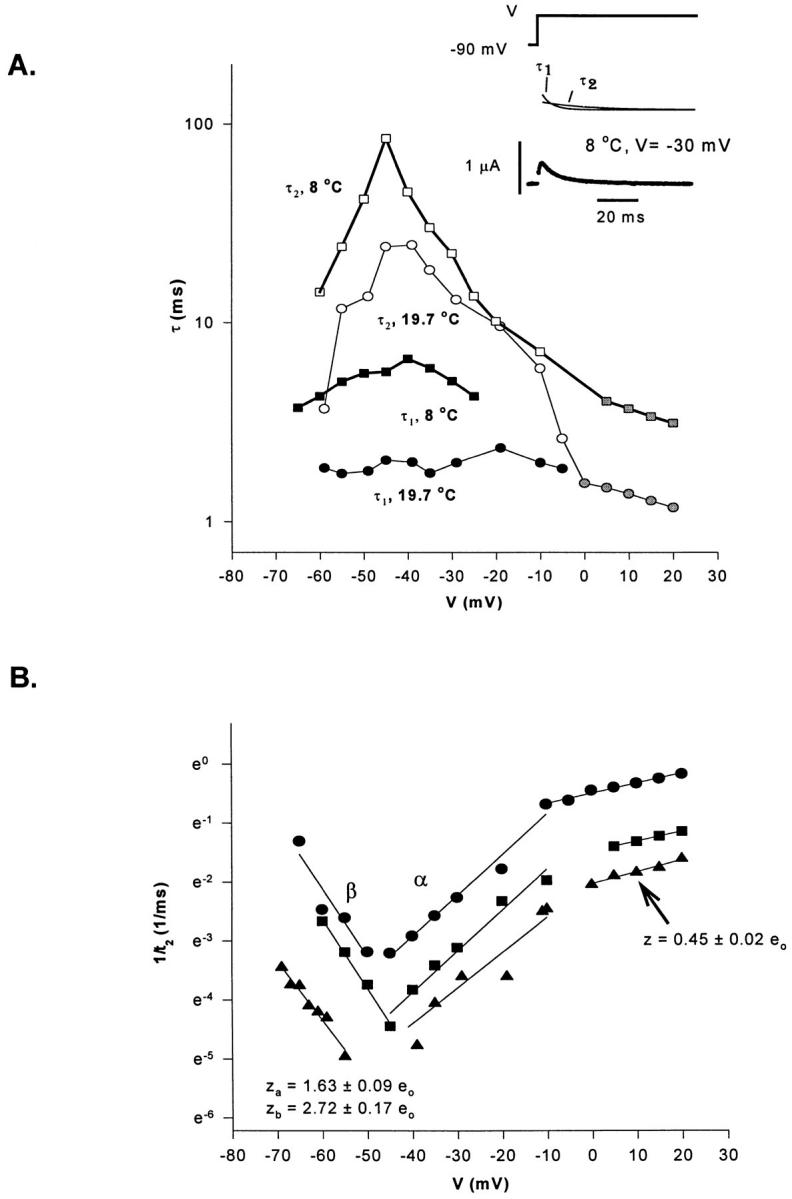 Figure 12. Time constants (τ) of the decaying components of the On response of gating currents as a function of voltage (V). (A) Voltage and temperature dependence for each kinetic component for three different experiments. Open symbols represent the slow decaying component: ○ at 19.7°C, □ at 8°C. Closed symbols represent the fast decaying component: • at 19.7°C, ▪ at 8°C. Gray symbols indicate the voltage region where the On response was fitted with one exponential function. (B) Time constant of the slow decaying component (1/τ2, 1/ms) as a function of voltage (V). Determination of the valence times the fraction of the electric field (z). Data obtained from the same experiment shown in A at three different temperatures: 19.2°C, •; 8°C, ▪; 4.5°C, ▴. Lines represent the linear regression used to estimate z from the slope of each curve (slope = z.F/ RT) at each voltage region. Notice the change in the slope for the data obtained at depolarized potentials (>−10 mV), corresponding to z = 0.45 ± 0.02 eo (n = 3). Between −65 and −45 mV, backward rates predominate, z = 2.72 ± 0.17 eo (n = 3). Between −45 and −10 mV, forward rates predominate: z = 1.63 ± 0.09 eo (n = 3).