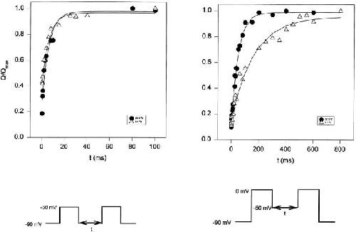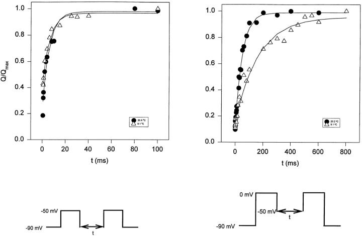Figure 13. Reactivation of gating currents after a variable recovery interval showing the kinetic behavior for each component of the total charge movement. Normalized charge movement (Q/Qmax) as a function of the duration of the test-pulse (t, ms) at two different temperatures (20.5 and 9.1°C). Data obtained from the integration of the On response of the gating currents elicited using the double-pulse protocol (Oxford, 1981), between −90 and −50 mV (left), and between −50 and 0 mV (right).