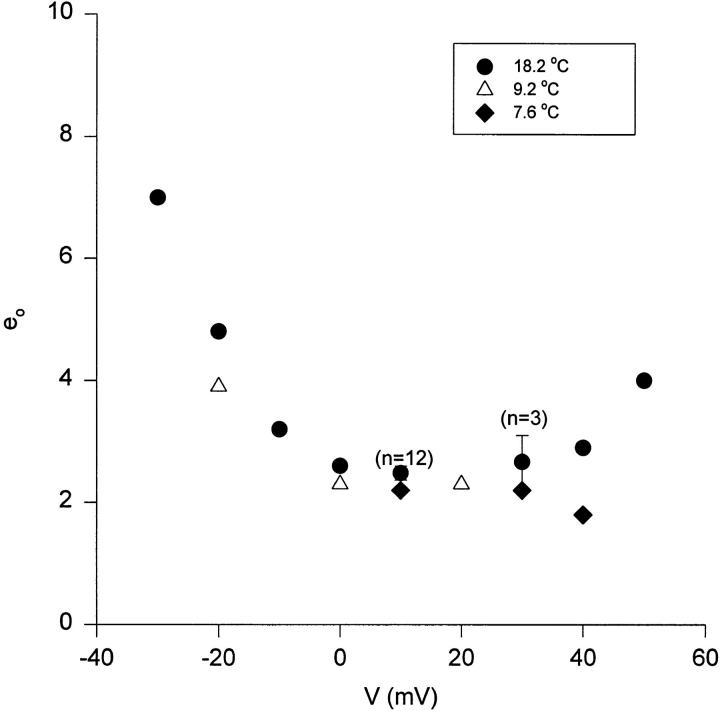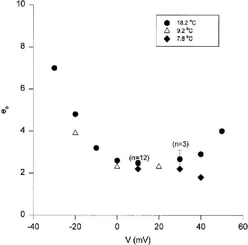 Figure 15. Elementary gating charge movement. Temperature and voltage dependence. Measurement of the elementary charge movement (eo) estimates the value of the predominant charge transfer in the activation pathway. Gating current ensembles consisting of >100 traces at each voltage in the saturated region of the Q-V were obtained with the macropatch technique. The experiment was performed at three temperatures (18.2°C, •; 9.2°C, ▵; and 7.6°C, ♦).