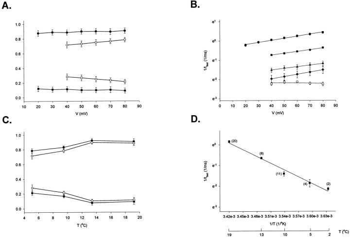 Figure 2. Kinetics of ionic current activation in response to depolarized potentials (>20 mV). Ionic currents were fit to a sum of two exponential functions: I(t) = a + bexp(−t/τ1) + c exp(−t/τ2), where I(t) is the macroscopic ionic current as a function of time, t. The ionic current trace was fitted after the initial delay. (A) Proportion of kinetic components of ionic currents obtained at depolarized potentials as a function of voltage at two different temperatures 19.2°C (•, ▪) and 5.1°C (○, □). (B) Reciprocal of the time constant of the fast kinetic component (1/τfast) as a function of voltage (V). Estimation of the valence times the fraction of electric field (z) from the slope = zF/RT. The value of z obtained at each temperature tested (between 19.2 and 5.1°C) is between 0.2 and 0.28 eo. (C) Proportion of kinetic components of ionic currents obtained at depolarized potentials as a function of temperature from ionic currents obtained at two different test pulses: 40 mV (○, □) and 80 mV (•, ▪). (D) Arrhenius plot for the fast kinetic component from ionic currents elicited by a test pulse to 50 mV. The energy of activation (Ea) obtained from the slope = −Ea/R. Results shown in A–D as the mean ± SEM from several experiments.