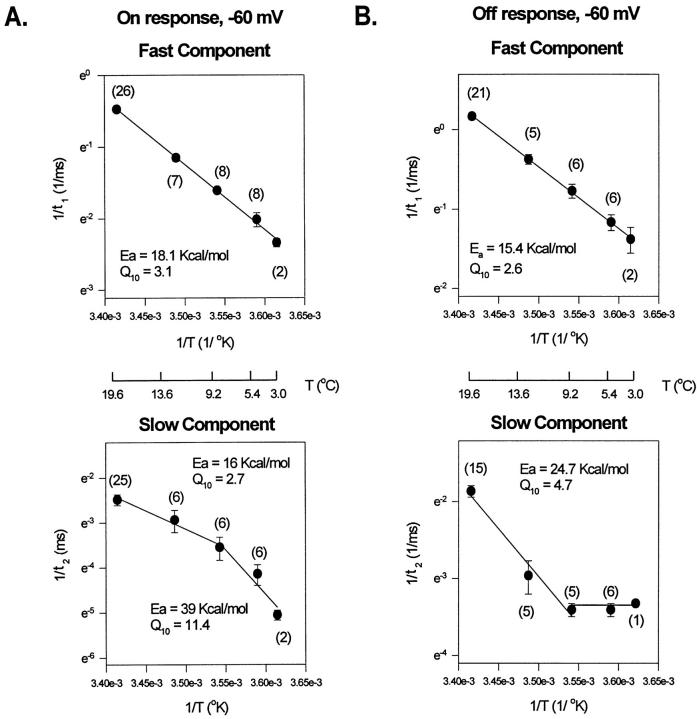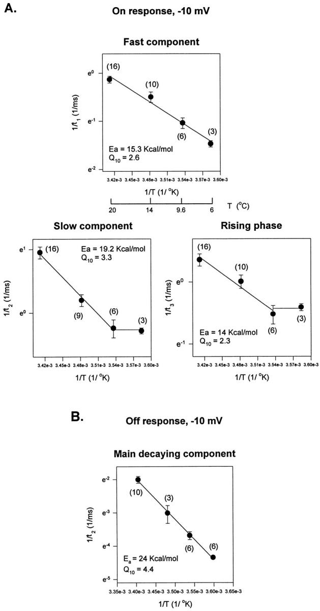 Figure 11. Arrhenius plots of kinetic components describing the gating currents elicited as a response to a test pulse of −10 mV. (A) Arrhenius plots for the On response kinetic components: fast component, slow component, and rising phase. (B) Arrhenius plot for the main decaying component of the Off response. The Arrhenius plot for the time constant of the faster decaying component that appears at low temperatures was not included (see Fig. 9).