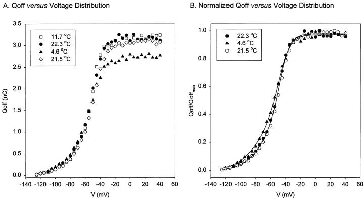 Figure 14. Q-V distributions at different temperatures. (A) Nonnormalized data from the experiment (Qoff, charge movement during the Off response versus V, voltage). Data obtained from unsubtracted gating current traces elicited from variable test pulses (V). At 11.7 and 4.6°C (□, ▴) test-pulse duration was 300 ms. At 22°C (•, ⋄), test-pulse duration was 100 ms. (B) Normalized data obtained at 4.6°C (▴) and 22°C (•, ○) (Q/Qmax versus V curve). The continuous line corresponds to the fitting with a two-step sequential Boltzmann distribution (see Eq. 6). Parameters obtained from the fit: n = 4 × 109 channels (average value for low and high temperature); z1 = 1.70 ± 0.11 eo (n = 2); z2 = 3.13 ± 0.29 eo (n = 2). At 22°C, V1 = −73.35 mV; V2 = −48.87 mV; Q1 = 0.34; Q2 = 0.64. At 4.6°C, V1 = −80.01 mV; V2 = −50.34 mV; Q1 = 0.35; Q2 = 0.62. At low temperature, the first component is shifted to the left by −7 mV, corresponding to a net decrease in entropy of ∼4 kcal/ mol at 20°C (see Table II).
