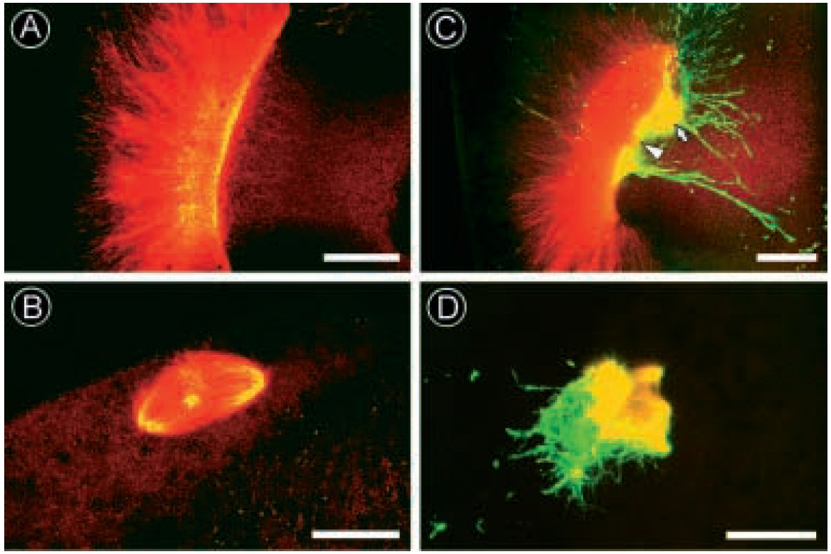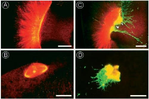 Fig. 8. Injection of anti- XMAP230 disrupts the assembly of the transient MT array and meiotic spindles during oocyte maturation. (A and B) Injection of nonimmune rabbit IgG had little or no affect on the organization of the MTOCTMA (A) or first meiotic spindle (B; shown in transverse orientation, see Gard, 1992). The injected non-immune rabbit IgG did not decorate either the MTOCTMA or the meiotic spindle. (C) Injection of anti- XMAP230 disrupted the organization of the MTOCTMA, often resulting in the apparent splitting of the MTOC (arrowhead) or the formation of large MT aggregates (arrow). (D) Injected oocytes subsequently assembled poorly organized MT aggregates or severely distorted spindles that were heavily stained by the injected antibodies. Oocytes in C and D were stained with anti-acetylated a-tubulin (red channel) and fluorescein anti-rabbit (green channel) to show the injected antibody. Bars: 25 mm (A and C); 10 mm (B and D). |