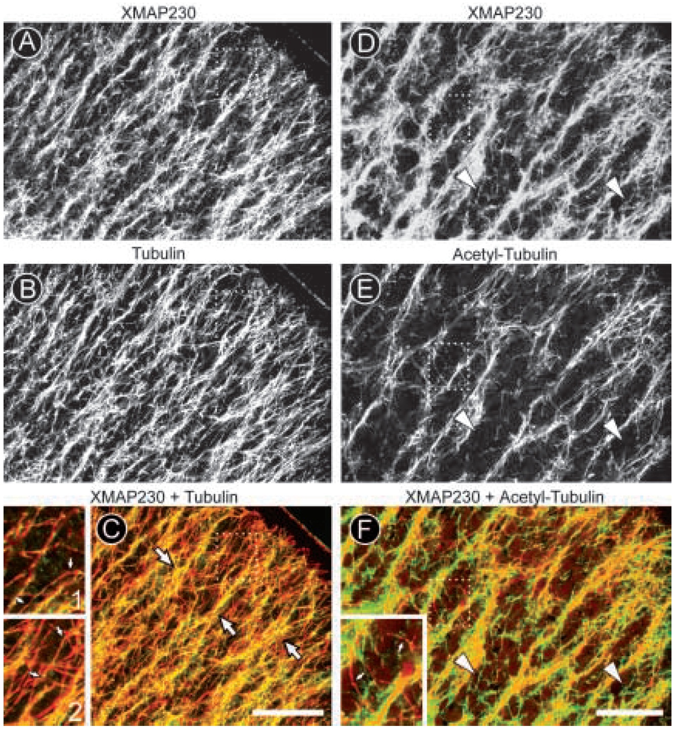 Fig. 3. XMAP230 is associated with MTs in stage VI oocytes. (A-C) This stage VI oocyte was stained with both anti-XMAP230 (A; green channel in C) and monoclonal anti-a-tubulin (B; red channel in C). Many individual MTs were stained with both anti-XMAP230 and antitubulin, and appear yellow in the merged image (arrows in C). Close examination reveals the punctate distribution of anti-XMAP230 along some MTs, which exhibit patches of red in the merged image (arrows in insets; insets 1 and 2 are enlargements of the region within the dotted rectangle in C, and are projections of 2 and 4 optical sections, respectively). (D-F) Localization of XMAP230 along acetylated MTs was also apparent in oocytes stained with anti-XMAP230 (D and green channel in F) and antibodies specific for acetylated a-tubulin (E and red channel in F). XMAP230 was distributed in patches of variable length along some acetylated MTs. The inset in F shows the region boxed with a dotted line at higher magnification. Acetylated MTs with patches of XMAP230 are indicated with arrows. A small number of MTs stained by anti- XMAP230 were not detectably stained by anti-acetylated a-tubulin (large arrowheads in D-F). Figures are projections of 4-5 serial optical sections collected at 0.5 mm intervals. Bars, 25 mm. |