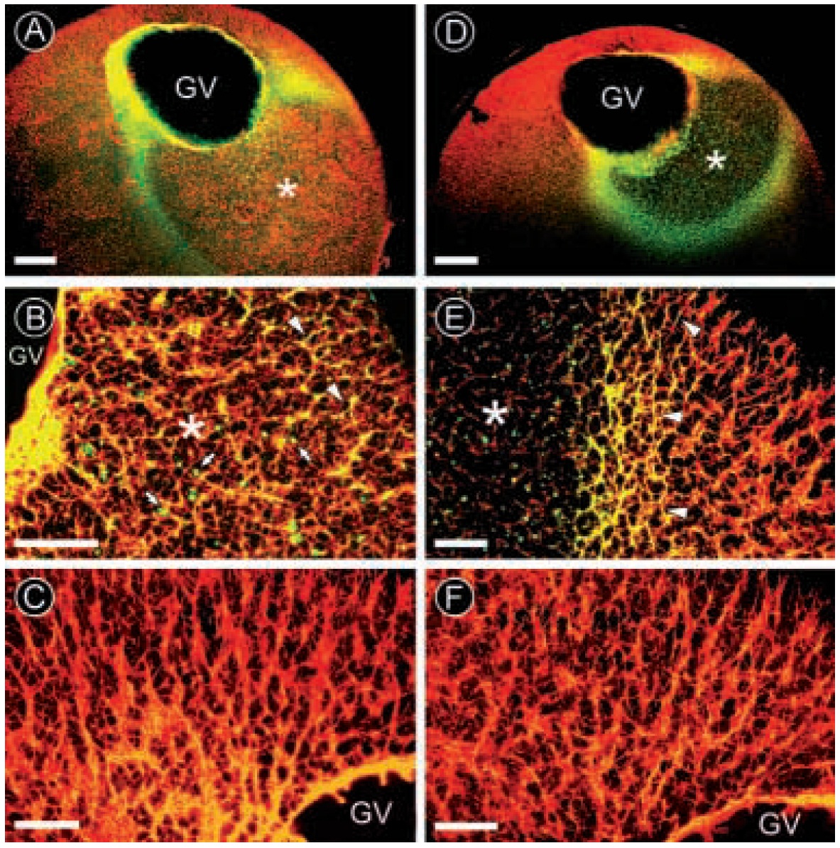 Fig. 6. Microinjection of anti- XMAP230 disrupts MT organization and acetylation in stage VI oocytes. (A) A low magnification view of an oocyte fixed 12 to 18 hours after microinjection of affinitypurified anti-XMAP230, and stained with monoclonal anti-a- tubulin (red channel) to reveal MTs and fluoresceinconjugated anti-rabbit IgG (green channel) to detect the injected antibody. The injection site (*) was easily recognizable due to the presence of insoluble antibody-antigen complexes (seen better in B; arrows) and a ‘ring’ of injected antibody bound to MTs. (B) Numerous disordered MTs were apparent in the injected side of another oocyte stained for a-tubulin and injected antibody. Near the periphery of the injection site, individual MTs were decorated with the injected anti- XMAP230 (arrowheads), and thus appeared yellow. Arrows denote brightly-stained aggregates of injected antibodies. (C) The MT array of the uninjected side of the same oocyte appeared unaffected. (D) A low magnification view of an oocyte fixed 12 hours after injection of anti- XMAP230, and stained to reveal acetylated MTs (red channel) and injected XMAP230 antibody (green channel). Staining of acetylated MTs (red) on the injected side (*) was visibly reduced in intensity compared to the uninjected side. (E) The staining intensity and number of acetylated MTs was visibly reduced in the region of injected antibody (*). Near the margin of the injection site, individual MTs stained by anti-acetylated a-tubulin were also decorated with the injected XMAP230 antibodies (arrowheads), and thus appeared yellow. (F) The organization and number of acetylated MTs in the uninjected side of the same oocyte appeared unaffected. Bars, 25 mm. |