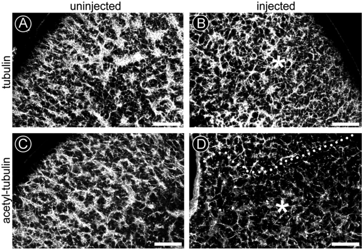 Fig. 7. Injection of anti-XMAP230 into stage VI oocytes inhibits MT acetylation during recovery from cold-induced MT depolymerization. Stage VI oocytes injected with anti-XMAP230, were incubated at 0-2°C for 2 hours to depolymerize MTs, and were allowed to recover for 18 hours at room temperature prior to fixation for immunofluorescence microscopy. (A and B) Substantial MT assembly was apparent in both the uninjected (A) and injected (B) sides of an oocyte stained with anti-a-tubulin. (C) Substantial numbers of acetylated MTs were apparent in the uninjected side of an oocyte stained with 6-11B-1. (D) The intensity of staining and number of acetylated MTs stained by 6-11B-1 was visibly reduced on the injected side of the same oocyte (* denotes the region of injected antibody; the approximate extent of antibody diffusion is denoted by the dotted line). Bars, 25 mm. |