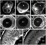 Fig. 2. XMAP230 antibodies stain MTs during early oogenesis. (A) The MT network of interphase oogonia was brightly stained by anti- XMAP230 (arrow points to the centrosome). (B) XMAP230 staining was concentrated in the cytoplasm (asterisk) of post-mitotic (stage 0) oocytes, but the density of the MT array prevented resolution of individual MTs (see text). (C) However, staining of individual MTs with anti-XMAP230 was readily apparent in stage 0 oocytes subjected to MT disassembly and regrowth (see text; arrow denotes the centrosome; N, nucleus). (D) MTs in an early stage I oocyte (50-75 mm in diameter) were faintly stained with XMAP230 antibody (GV denotes the germinal vesicle, or oocyte nucleus). (E) MTs of late stage I oocytes (>100 mm in diameter) were not detectably stained by anti-XMAP230. (F) Anti-a-tubulin revealed extensive MT arrays in oocytes of this size. (G) Radiallyoriented MTs were apparent in stage III oocytes stained by anti-a-tubulin. (H) MTs in stage III oocytes were not detectably stained by anti-XMAP230. Note that follicle cells surrounding stage I-III oocytes in D, E, and H were intensely stained by anti-XMAP230 (arrows in E and H). Bars: 5 mm (AC), 10 mm (D), and 25 mm (E-H). |