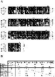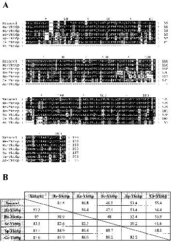 conserved amino acid is boxed with black and gray, respectively. (B) The numbers above the diagonal are absolute amino acid similarities,