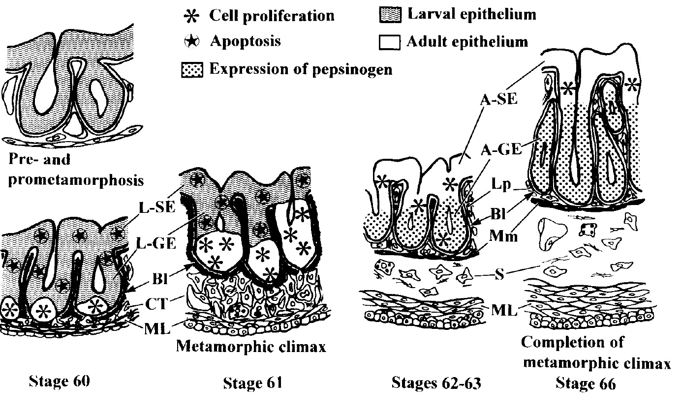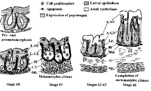 It is generally known that the anuran stomach begins to express pepsinogens (Pg) during metamorphosis. To clarify the mechanisms of differentiation of Pg-producing cells, we examined immunohistochemically the epithelial transformation from larval to adult form in Xenopus laevis stomach at the cellular level. At the beginning of metamorphic climax, concomitantly with the modification of the basement membrane, apoptotic cells labelled by TUNEL suddenly increased in number in the entire epithelium except for the primordia of adult epithelial cells in the basal region of larval glands. Subsequently, with the development of connective tissue, the adult epithelial cells actively proliferated and replaced the larval cells from the basal to the luminal region. Following the start of morphogenesis of adult glands, Pg-producing cells became differentiated in newly formed adult glands, but not in the adult surface epithelium. We then developed an organ culture system and examined effects of thyroid hormone (TH) on the differentiation of Pg-producing cells in X. laevis stomach in vitro. In the presence of TH, just as in spontaneous metamorphosis, Pg-producing cells differentiated from the adult epithelial primordia after the apoptosis of larval epithelial cells. In contrast, in the absence of TH, neither apoptotic larval cells no Pg-producing cells were detected. Therefore, we conclude that TH triggers organ-autonomously the entire process leading to the differentiation of Pg-producing cells in X. laevis stomach. In addition, the strict localization of Pg-producing cells in the adult glands both in vivo and in vitro suggests the correlation between the differentiation of Pg-producing cells and morphogenesis of the glands surrounded by the developed connective tissue.