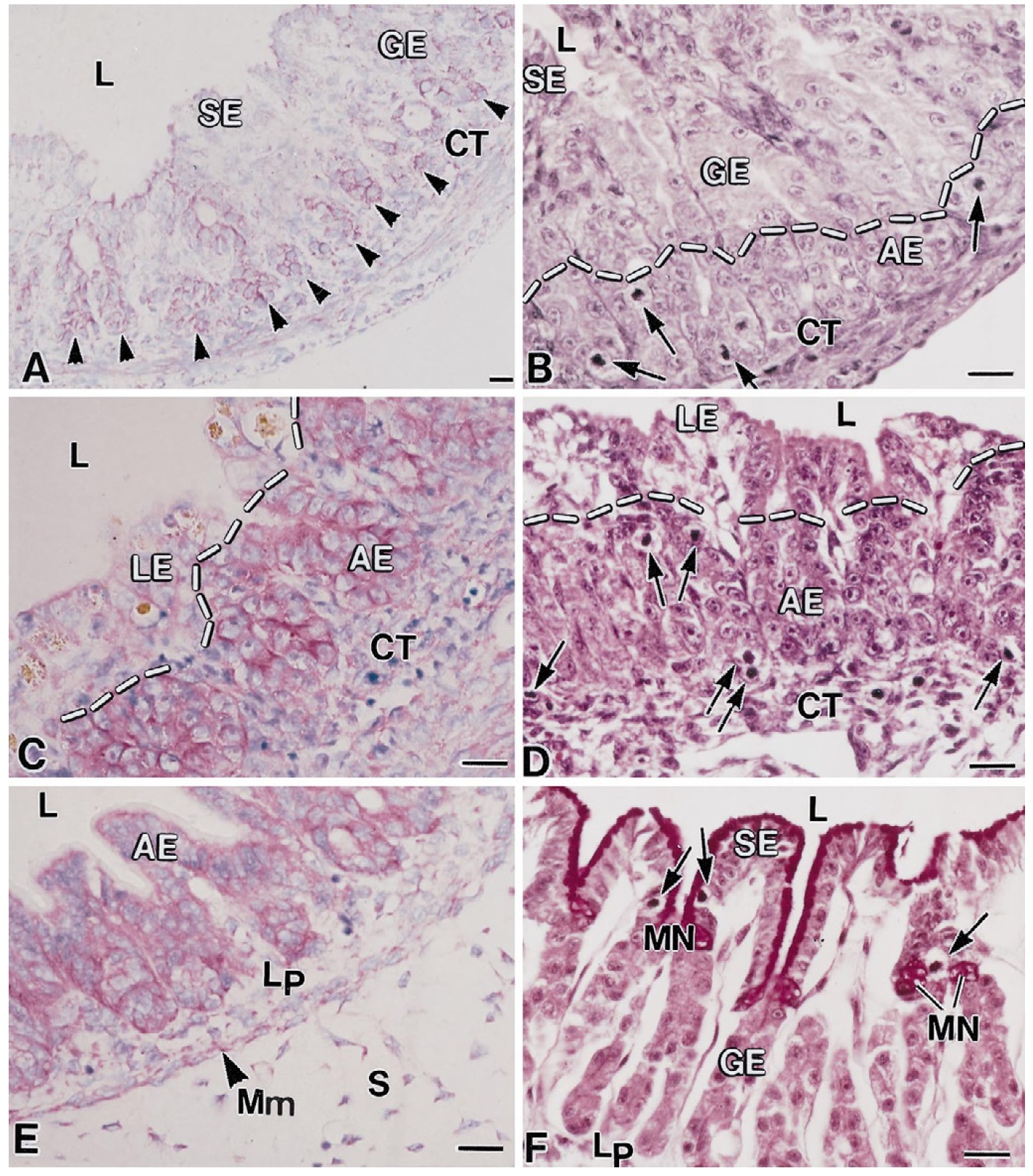 (Lp) and the submucosa (S). F