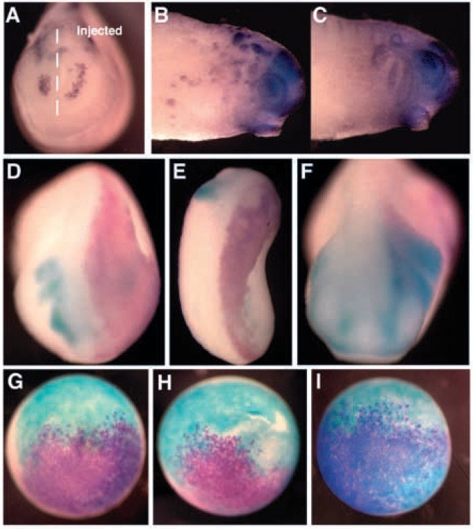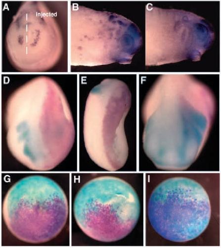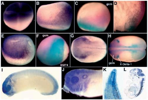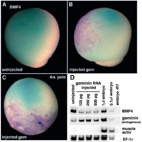 (E) Coinjection of BMP4 and geminin; dark-purple tissue expresses