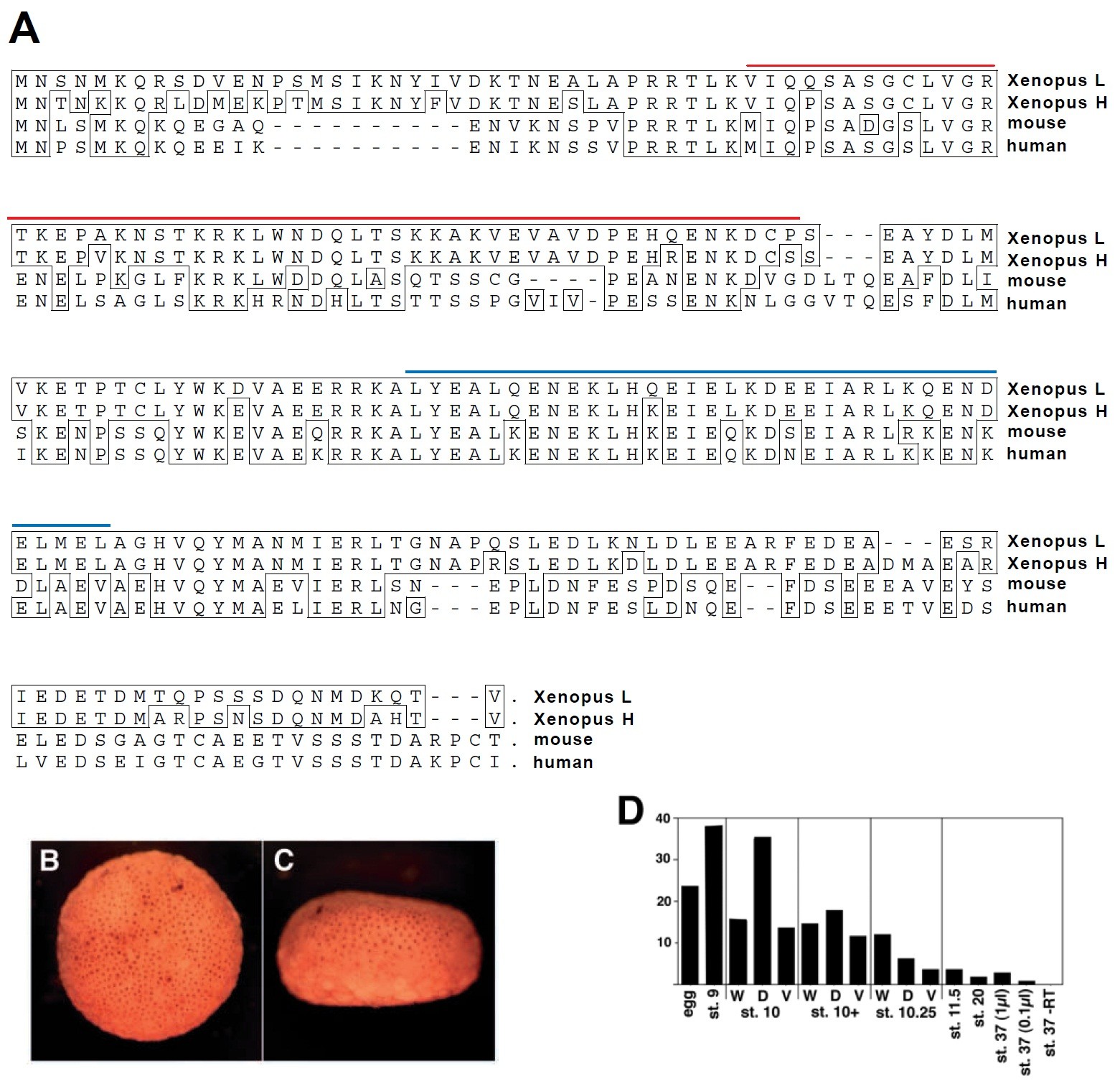 Fig. 3. Structure, intracellular localization and developmental profile of geminin expression in embryos. (A) Protein sequences of geminin. The