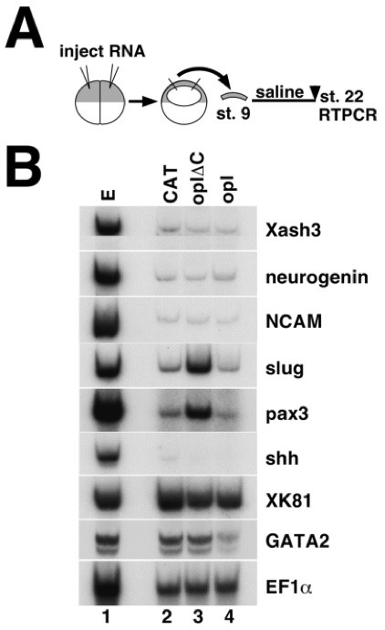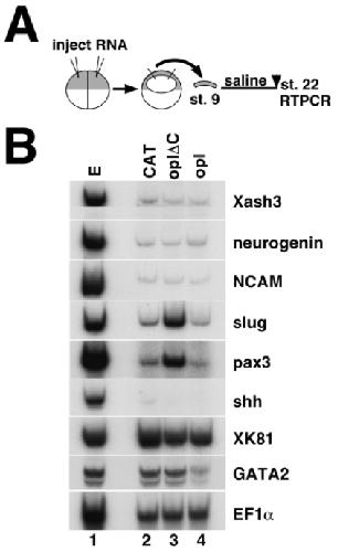 (B) Expression of marker genes in animal caps. Uninjected embryos serve as control for baseline expression level. Xash3 (Zimmerman et al., 1993), neurogenin (Ma et al., 1996)and NCAM (Kintner and Melton, 1987) are neuralspecific markers; slug (Mayor et al., 1995) is a neural crest marker; pax3 (Espeseth et al., 1995) marks the dorsal neural tube, shh marks the floorplate (Ekker et al., 1995); XK81 (Jonas et al., 1985) and GATA2 (Walmsley et al., 1994) are markers of the ventral ectoderm; EF1a (Krieg et al., 1989) served as loading control. Samples processed without RT did not show EF1a signal after PCR (not shown). Data from one representative experiment is shown; similar results were obtained from three experiments. Lane 1, stage 22 embryo; lane 2, CAT-injected animal caps; lane 3, oplDC-injected caps; lane 4, opl-injected caps.