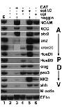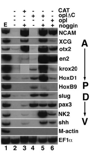 Fig. 10. opl synergizes with noggin to activate more posterior neural markers in animal caps. Wild-type embryos were injected in both blastomeres with indicated RNAs at the 2-cell stage, using 200 pg CAT, opl or oplDC, and 10 pg noggin (Smith and Harland, 1992) RNAs, as diagrammed in Fig. 8A. Injection of CAT RNA served as negative control by equalizing the injected RNA dose. Pools of 15-20 animal caps were isolated from injected embryos at late blastula (stage 9) and incubated in saline until harvest at tailbud (stage 22) for RT-PCR analysis. See Methods for details. Expression of a set of neural markers expressed along the anteroposterior (A/P) or dorsoventral (D/V) neural axes was analysed. Uninjected embryos serve as control for baseline expression level. NCAM is a general neural marker (Kintner and Melton, 1987). Expressed in the indicated anterior (A)-to-posterior (P) series: XCG is a cement gland marker, the most anterior ectodermal tissue (Sive et al., 1989); otx-2 is a forebrain and cement gland marker (Blitz and Cho, 1995; Pannese et al., 1995); en2 is a marker of mid/hindbrain boundary (Hemmati-Brivanlou and Harland, 1989); krox20 marks rhombomeres 3 and 5 in the presumptive hindbrain (Bradley et al., 1993); HoxD1 is a hindbrain (posterior to rhombomere 4) and spinal cord marker (Kolm and Sive, 1995a), and HoxB9 is a spinal cord marker (Wright et al., 1990). Expressed in the indicated dorsal (D) to ventral (V) series of markers, slug (marking the neural crest, (Mayor et al., 1995)), pax3 (marking the dorsal neural tube, (Espeseth et al., 1995)), NK2 (marking the ventrolateral neural tube, (Saha et al., 1993)) and shh (marking the floorplate, (Ekker et al., 1995)). M-actin (Mohun et al., 1984) is a mesodermal marker; EF1a (Krieg et al., 1989) served as loading control. Samples processed without RT did not show EF1a signal after PCR (not shown). Data from one experiment are shown, comparable results were obtained in four independent experiments. Lane 1, stage 22 embryo; lane 2, uninjected animal caps; lane 3, noggin plus CAT-injected; lane 4, oplDC-injected; lane 5, noggin plus oplDC-injected; lane 6, noggin plus opl-injected.