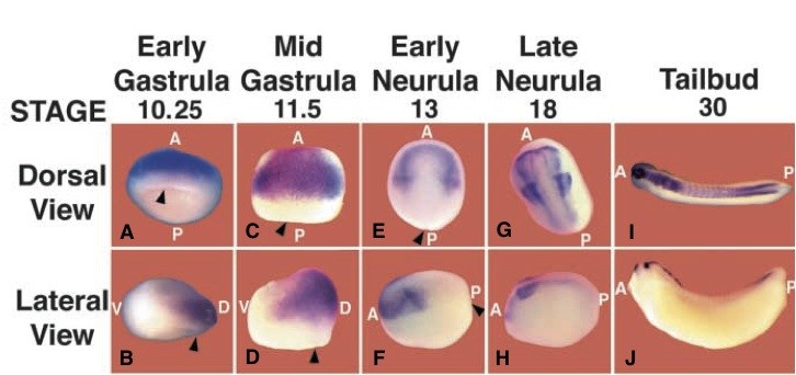 Fig. 3. Whole-mount in situ analysis of opl expression. Embryos were analyzed by in situ hybridization as described in Methods. Embryo orientations are indicated by A, anterior; P, posterior; D, dorsal and V, ventral; arrowhead, dorsal lip of blastopore