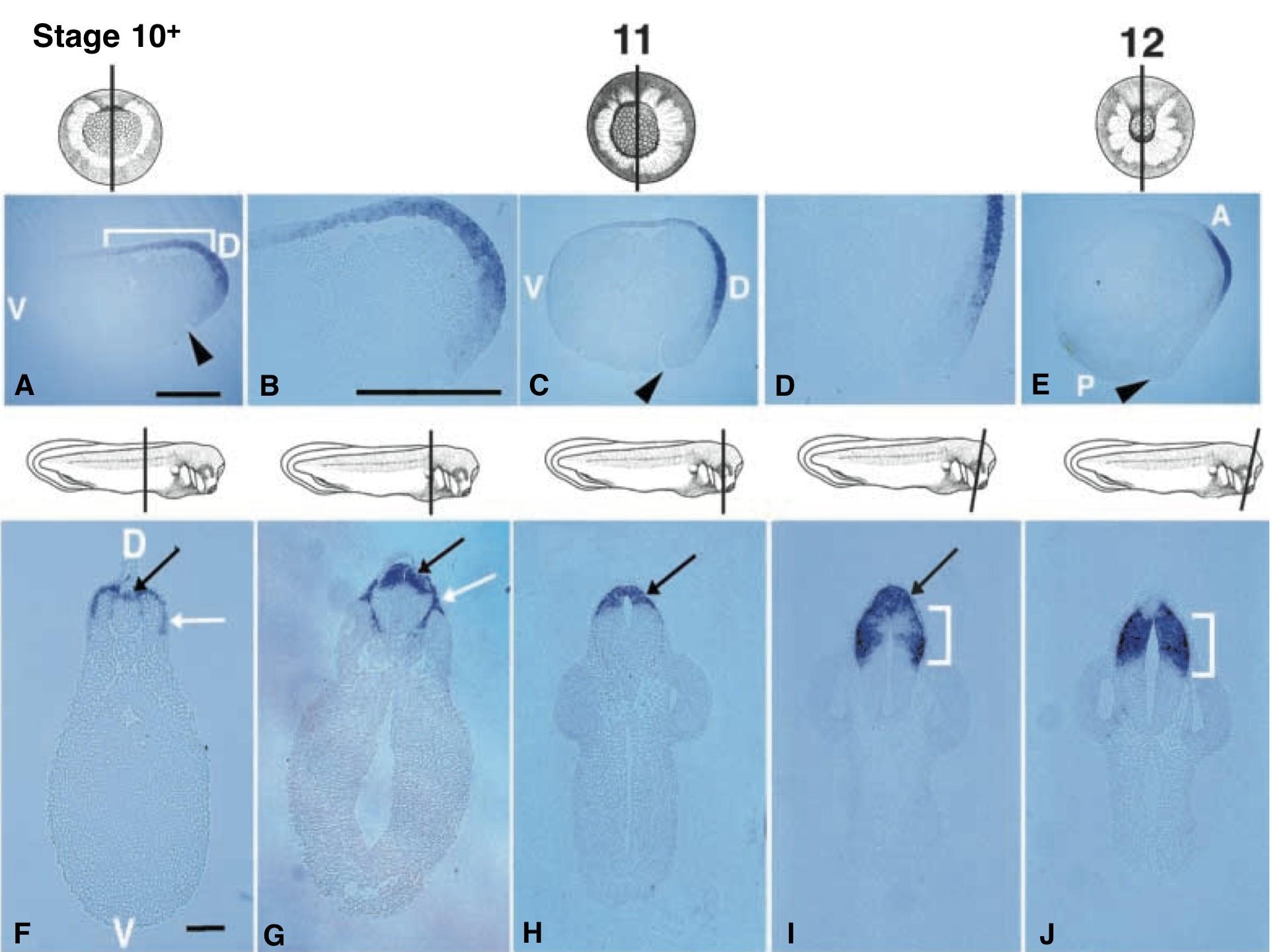 Embryos were fixed, embedded and sectioned as described in Methods. Sectioning planes are shown in schematic diagrams above panels. Black arrowheads indicate position of dorsal blastopore lip. Black arrows indicate opl expression in roofplate. White arrows indicate spinal crest expression. Brackets indicate alar plate expression in forebrain/midbrain regions.
