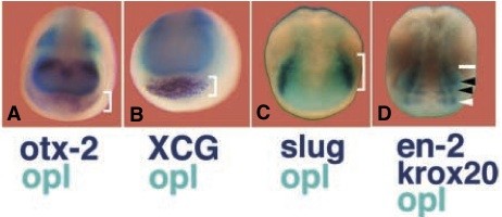 In situ analysis was as described in Methods with opl stained light blue and all other markers (otx-2, XCG, slug, en-2, krox20) are stained purple.