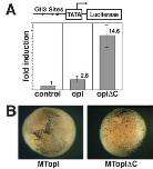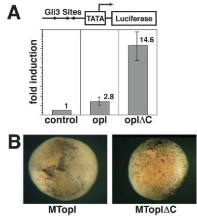 (A) opl protein transactivates reporter constructs in tissue culture. Transient transfection reporter assays were performed as described in Methods, using the human pancreatic tumor BXPC cell line. The reporter construct is shown schematically: three Gli3 DNA-binding sites are located 5to a basal promoter (TATA box) and luciferase reporter gene (Vortkamp et al., 1995) Data shown are the averages of three independent experiments with corresponding error bars. In the absence of the Gli3-binding sites, neither opl nor oplDC activated a reporter construct (not shown). DNA mixes for transient transfections are as follows, Left panel, reporter plus CS2+ vector; middle panel, reporter plus CS2+opl ORF right panel, reporter plus pCS2-oplDC.