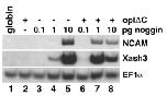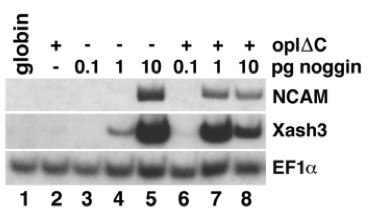 Wildtype embryos were injected in both blastomeres with indicated RNAs at the two-cell stage, using 200 pg globin or oplDC, and 0.1 pg. 1 pg or 10 pg noggin (Smith and Harland, 1992) RNAs, as diagrammed in Fig. 8A, except injection of globin RNA served as negative control by equalizing the injected RNA dose in all lanes. Pools of 15-20 animal caps were isolated from injected embryos at late blastula (stage 9) and incubated in saline until harvest at tailbud (stage 22) for RT-PCR analysis. See Methods for details. Expression of neural markers NCAM (Kintner and Melton, 1987) and Xash3 (Zimmerman et al., 1993) was analysed. EF1a served as loading control (Krieg et al., 1989). Samples processed without RT did not show EF1a signal after PCR (not shown). Data from one representative experiment is shown, similar results were obtained from three experiments. Lane 1, globin-injected caps; lane 2, caps injected with 200 pg oplDC RNA; lane 3, caps injected with 0.1 pg noggin RNA; lane 4, caps injected with 1 pg noggin RNA; lane 5, caps injected with 10 pg noggin RNA; lane 6, caps injected with 0.1 pg noggin RNA plus 200 pg oplDC RNA; lane 7, caps injected with 1 pg noggin RNA plus 200 pg oplDC RNA; lane 8, caps injected with 10 pg noggin RNA plus 200 pg oplDC RNA.