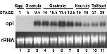 Fig. 2. (A) Northern analysis of Xenopus embryos. One embryo equivalent per lane was analyzed for opl RNA (top row) at various