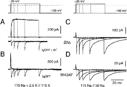 Figure 1. W434F channels conduct Na+ ions in the absence of internal K+. (A–D) Inside-out macropatch currents from oocytes expressing inactivation-removed ShΔ and W434F channels were evaluated in K+-containing (left) and K+-free Na+ (right) solutions. (A) In physiological solutions, ShΔ channels conduct K+ currents. To permit kinetic comparisons with records in different ionic conditions, the tail current sections of these traces have been magnified 10-fold (inset). (B) The W434F mutant in the presence of K+ ions does not permit ionic current, thus exposing only the ON and OFF gating charge movements. (C) Kinetics of the Na+ tail currents from ShΔ channels in K+-free solutions show a strong dependence on test pulse duration (Starkus et al., 1997). The fast tail currents seen at the shortest test pulse durations convert to slow tail currents as test pulse duration is increased. (D) W434F channels do not undergo marked alterations in kinetics as test pulse duration is increased, as would be expected if these channels are permanently C-type inactivated. The W434F Na+ tail currents are strikingly similar in their kinetics to the ShΔ tail currents after the longest test pulse duration shown here (64 ms). All traces were digitally low-pass filtered at 1 kHz.