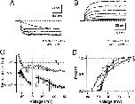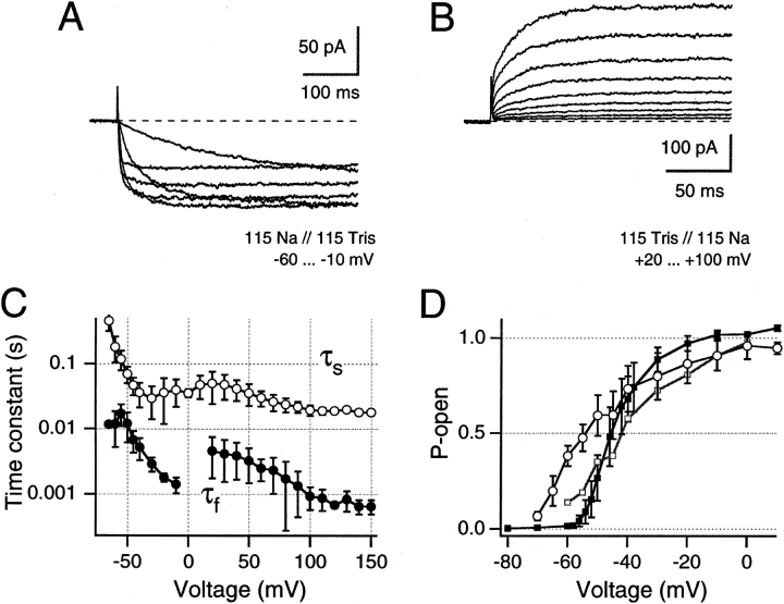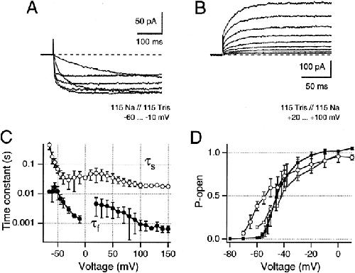 Figure 3. Activation kinetics of Na+ currents through W434F channels. (A) Inside-out current recordings with asymmetrical 115 Na//115 Tris solutions in response to depolarizations ranging from −60 to −10 mV. (B) Current traces elicited by voltage steps ranging from +20 to +100 mV using an inverted Na+ gradient: 115 Tris//115 Na. Holding potential in A and B was −100 mV. (C ) The time course of activation was described by double-exponential data fits (Eq. 2). The resulting time constants of the fast (τf, •) and slow (τs, ○) components are plotted as a function of the test potential. The data points were connected with straight lines. (D) The normalized open-probability after depolarizations for 500 ms was plotted as a function of the test potential. (○) W434F in Na//Na solutions, (□) C-type inactivated ShΔ in symmetrical Na//Na solutions, (▪) noninactivated ShΔ in K//K solutions. All data points are mean ± SD, n = 9–14.