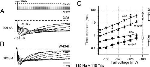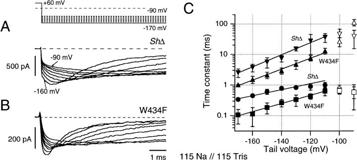 Figure 4. Kinetics of tail current deactivation in W434F channels. Na+ tail currents from C-type inactivated ShΔ (A) and W434F (B) channels are compared. All data traces are from inside-out patches in asymmetrical 115 Na//115 Tris solutions. Patches were depolarized for 100 ms at +60 mV; the subsequent tail voltages ranged from −90 to −170 mV. (C ) Deactivation time course was described by the sum of two exponential functions. Fits were started 200 μs after the start of the hyperpolarization step to avoid the open-channel currents associated with the rising phase of the voltage clamp. The resulting mean time constants are plotted as a function of the tail voltage. The symbols for the rising phase are (circles) ShΔ and (squares) W434F. The symbols for the falling phase are (downward triangles) ShΔ and (upward triangles) W434F. The data points indicated by filled symbols were used for the estimation of the voltage dependencies according to Eq. 1. The resulting apparent gating charges are for ShΔ: q(rise) = 0.57 e0, q(fall) = 1.15 e0; for W434F: q(rise) = 0.78 e0, q(fall) = 1.04 e0. All data points are mean ± SD, n = 5 patches.
