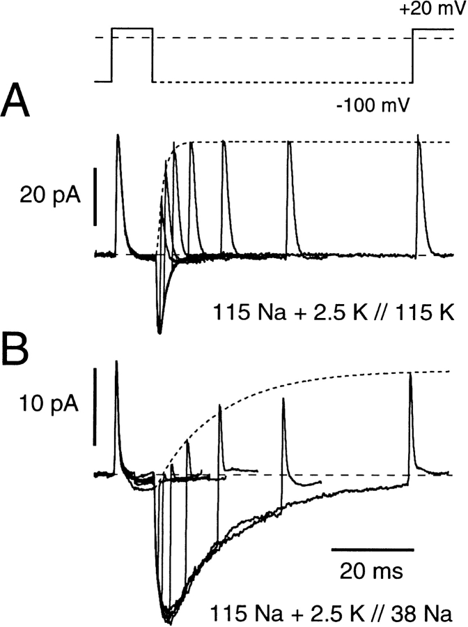 Figure 5. The rate of gating charge return in W434F channels is affected by ionic conditions. Double-pulse protocols with variable interpulse intervals were used to assess the kinetics of gating charge return by observing the recovery of IgON in the second pulse. (A) In the presence of internal K+, only gating currents are observed and recovery of peak IgON in the second pulse follows the falling phase kinetics of IgOFF. (B) In a K+-free internal Na+ solution, IgON shows an initial delay in recovery that coincides with the rising phase of the ionic tail current. This is followed by a recovery phase in which IgON peaks increase with a time course that parallels the deactivation phase of the ionic tail current. For dashed curves see text.