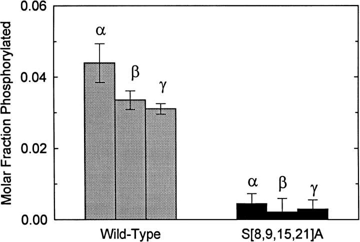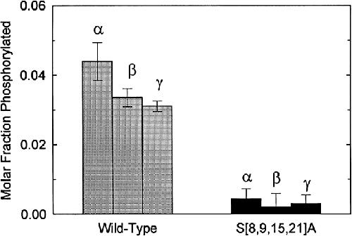 Figure 2. Phosphorylation of Kv3.4 NH2-terminal peptides by three PKC isoforms. Diacylglycerol-stimulated phosphorylation of the wild-type peptide and the mutant peptide S[8,9,15,21]A by PKCα, and PKCβ, and PKCγ (materials and methods). Values are expressed as the mean ± SD (n = 3).