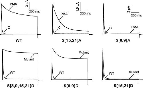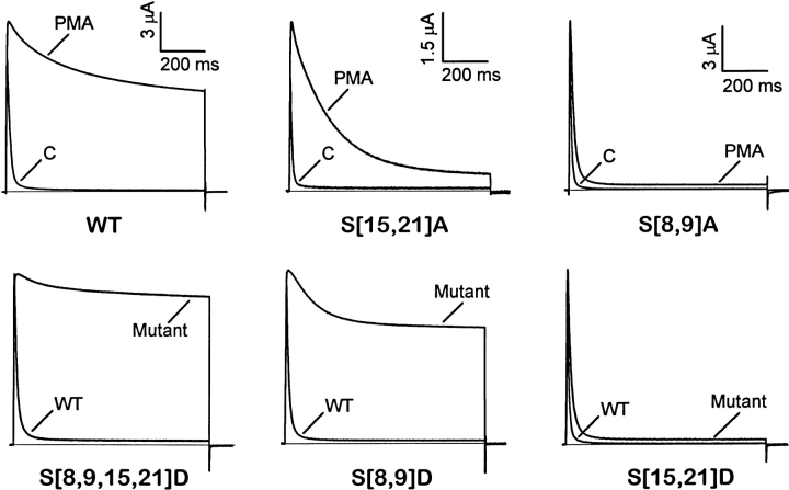 Figure 3. Comparison of PKC action and the effect of NH2-terminal S → D mutations on Kv3.4 inactivation. From a holding potential of −100 mV, 900-ms depolarizing pulses to +50 mV evoked all the currents. The solid horizontal line indicates the zero current level. (top) Currents expressed by wild type, S[15,21]A, and S[8,9]A in the absence and presence of 20 nM PMA (see Fig. 1). Currents are shown without normalization. (bottom) Currents expressed by S → D mutants (S[8,9,15,21)D, S[8,9]D, and S[15,21]D) and their corresponding wild type (no PMA was applied). For comparison, wild-type and S → D mutant peak currents are shown normalized.