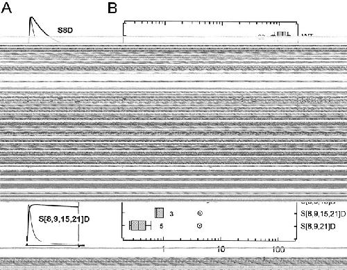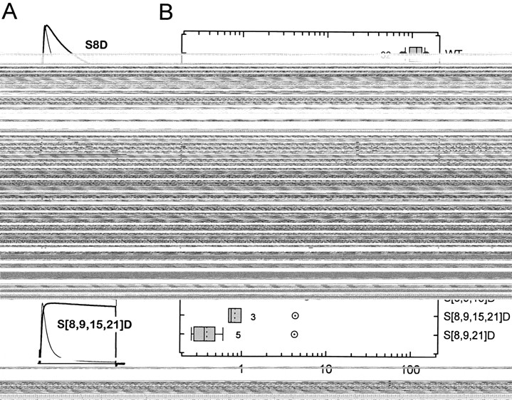 Figure 4. The rates of rapid inactivation of wild-type (WT) Kv3.4 and NH2-terminal S → D mutants. (A) Whole-oocyte currents evoked by 112-ms depolarizing pulses to +50 mV from a holding potential of −100 mV. Capacitive transients were subtracted using a scaled smooth template with no active currents (materials and methods). Each pair compares a mutant (thick trace) current and its corresponding wild type from the same batch of oocytes (thin trace). The solid horizontal line indicates the zero current level. Rates of rapid inactivation were determined as described in materials and methods. For mutant channels that exhibited very slow inactivation, long pulses (900 ms) were used to estimate the time constants of current decay. (B) Tukey box plot summarizing the data from wild type (WT) and mutants. Data were ordered from fast (top) to slow (bottom). Left and right borders of a box represent the 25th and 75th percentiles, respectively. Solid and dashed lines in the box correspond to the 50th percentile and the mean value, respectively. Left and right whiskers represent the 10th and 90th percentiles, respectively. Outliers are shown as •. The number of oocytes examined is indicated by the figure accompanying the boxes. Four oocytes expressing S[8,9,15]D were also examined. However, the time constants of inactivation from this mutant were not determined because it exhibited no inactivation in response to 900-ms pulses to positive membrane potentials. Open symbols with a dot represent the predicted rate of inactivation for multiple mutants assuming a simple additive effect of single mutations as described in materials and methods.