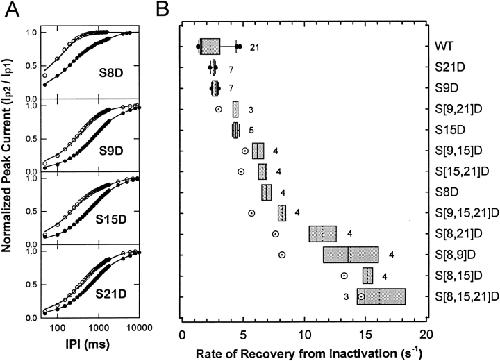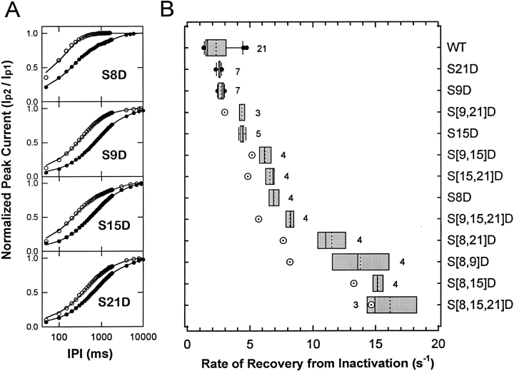 Figure 5. The rate of recovery from inactivation of wild-type (WT) Kv3.4 and several S → D mutants. (A) Time courses of recovery from inactivation of S8D, S9D, S15D, and S21D (○) and their corresponding wild-type from the same batch of oocytes (•). A two-pulse protocol was used to determine the time course of recovery from inactivation at −100 mV. Whole-oocyte currents were evoked and inactivated by a 150-ms step depolarization to +40 mV (p1) from a holding potential of −100 mV. This pulse inactivated ≥80% of the currents expressed by wild type, S8D, S9D, S15D, and S21D. The degree of inactivation at the end of the pulse decreases for the mutants that disrupted inactivation to a greater extent (∼20% for S[8,15,21]D). To allow recovery from inactivation, the interpulse interval (IPI, at −100 mV) was gradually incremented; and a 75-ms test pulse to +40 mV (p2) evaluated the recovery. The peak of the current evoked by the test pulse was divided by the peak of the current evoked by the first pulse (Ip2/Ip1), and this ratio was plotted against the interpulse interval. The time course of recovery was described assuming the sum of two exponential terms (solid lines, see text). The relative weight of the fast term was >65%. (B) Tukey box plot summarizing the results of the analysis of the fast rate of recovery from inactivation. Definitions of this plot are as described herein. The number of oocytes examined is indicated by the figure accompanying the boxes. We also examined S[8,9,15]D, S[8,9,21]D, and S[8,9,15,21]D. However, they were not analyzed quantitatively because they exhibited little or no inactivation (<20% using a 900-ms pulse) or the shortest interpulse interval used in these experiments (50–100 ms) allowed complete recovery from inactivation. Open symbols with a dot represent the predicted rate of recovery from inactivation for multiple mutants assuming a simple additive effect of single mutations as described in materials and methods.
