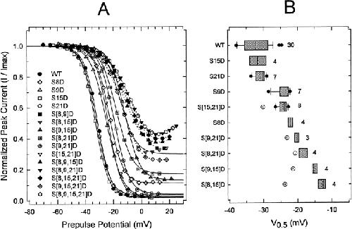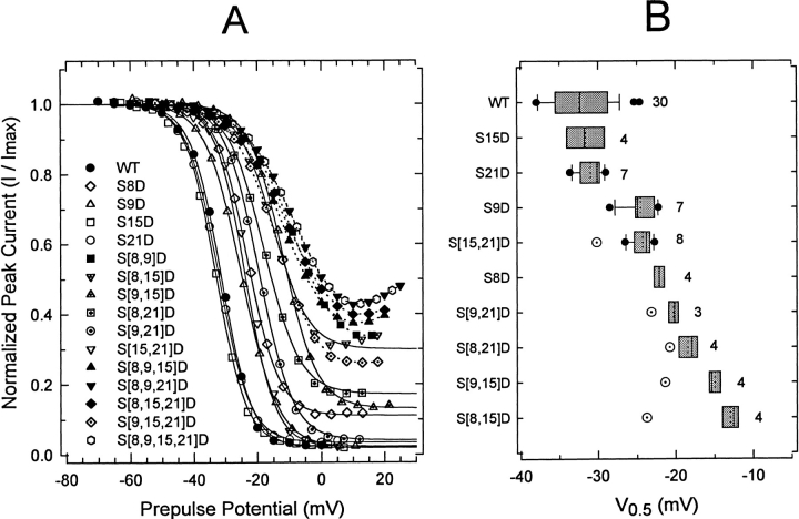 Figure 6. Prepulse inactivation of wild-type Kv3.4 and several S → D mutants. (A) Graph of the normalized peak current against prepulse potential. During a 10-s period, the membrane was held at the indicated prepulse potentials (abscissa). A 112-ms test pulse to +40 mV was delivered at the end of the prepulse. Between episodes, the membrane potential was held at −100 mV and the interepisode interval was no longer than 6 s. The peak of the current evoked by the test pulse was plotted against the prepulse potential and the resulting curve was described assuming a Boltzmann distribution (solid line) to estimate the midpoint potential (V0.5), the slope, and the fraction of noninactivating current (Table I). For display, data were normalized to the maximum current estimated from the Boltzmann distribution (I/Imax). Prepulse inactivation curves from S[8,9]D, triple mutants, and S[8,9,15,21]D were not analyzed quantitatively because they are significantly biased by current activation (notice that these curves exhibit a reduced steepness and a rebounding effect at the foot of the curves). In these cases, the symbols are connected by a dotted line. (B) Tukey box plot summarizing the midpoint potentials of the prepulse inactivation curves from wild-type and several double S → D mutants (see Fig. 4, legend, for definitions). The number of oocytes examined is indicated by the figure accompanying the boxes. Open symbols with a dot represent the predicted values for the double mutants assuming a simple additive effect of single mutations (relative to wild type, the shifts in the midpoints were added and the result added to the wild-type value).