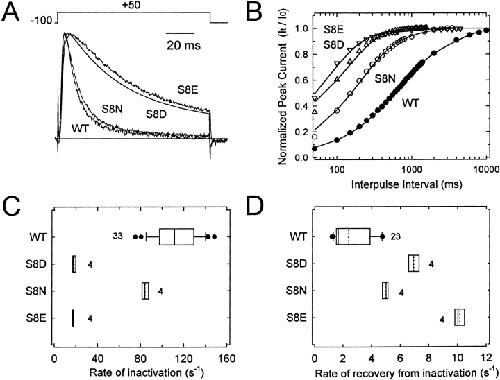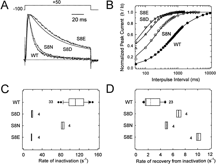 Figure 7. The effects of neutral and negatively charged substitutions affecting S8. (A) Whole-cell currents from oocytes expressing wild-type Kv3.4 (WT) and the mutants S8N, S8D, and S8E. The pulse protocol is shown above the currents. For comparison, currents are shown normalized. The peak currents were (μA): 8.5, 10.4, 3.5, and 10.9 for wild type, S8N, S8D, and S8E, respectively. Capacitive transients were subtracted on-line using a P/4 protocol. The solid horizontal line indicates the zero current level. (B) Time courses of recovery from inactivation of Kv3.4 (WT) and the mutants S8N, S8D, and S8E. The pulse protocol and analysis were as described in Fig. 5, legend. The time course of recovery was described assuming the sum of two exponential terms (solid lines, see text). The relative weight of the fast term was >65%. (C and D) Tukey box plots summarizing the rate constants of inactivation and recovery from inactivation obtained from the experiments described in A and B. Definitions of this plot are as described in Fig. 4, legend. The number of oocytes examined is indicated by the figure accompanying the boxes. Data for wild type and S8D were replotted from Figs. 4 and 5.