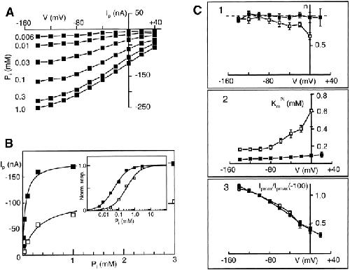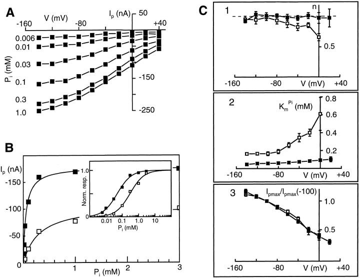 Figure 2. Steady state voltage dependency of Na+/Pi transport as a function of Pi. (A) Typical set of I-V curves obtained using staircase protocol (Fig. 1 B) applied to one cell with 96 mM Na+ and Pi in the range 0.006–1.0 mM as indicated. Data points are joined for visualization only. Note the absence of zero crossing for V > 0. (B) Representative dose-response curves at Vh = −50 mV for two concentrations of Na+: 96 (▪), 50 (□) mM and the same cell with Pi as the variable substrate. Eq. 1 was fit to the raw data with the following parameters: (96 mM Na+) KmPi = 0.054 mM, n = 0.8, Ipmax = 74 nA; and (50 mM Na+) KmPi = 0.27 mM, n = 0.9, Ipmax = 50 nA. Inset shows the same data normalized to maximum predicted response and plotted semi-logarithmically to indicate clearly the shift in KmPi. (C) Summary of voltage dependency of fitted parameters comparing data for two concentrations of Na+: 96 (▪) and 50 (□) mM pooled from different cells. Data are shown as mean ± SEM (N = 4). Only SEMs exceeding symbol size are shown. Data points are joined for visualization only. (C, 1) n = Hill coefficient, (dashed line) n = 1; (C, 2) KmPi = apparent affinity constant; (C, 3) Ipmax/Ipmax(−100) = maximum induced current normalized to the value at −100 mV.