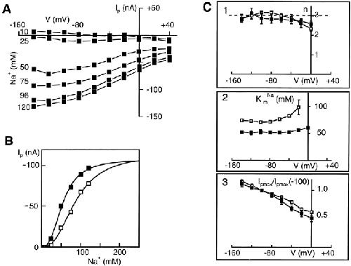 Figure 3. Steady state voltage dependency of Na+/Pi transport as a function of Na+ concentration. (A) Typical family of I-V curves obtained from one cell with 1 mM Pi and six Na+ concentrations as indicated (millimolar). Data points are joined for visualization only. (B) Typical dose-response data for the same cell at two Pi concentrations: 1.0 (▪) and 0.1 (□) mM with Na+ as the variable substrate and Vh = −50 mV. Eq. 1 was fit to the data points. For this cell, the fit parameters were: (1 mM Pi) KmNa = 50.1 mM, n = 2.6, Ipmax = 109 mM; and (0.1 mM Pi) KmNa = 89 mM, n = 2.6, Ipmax = 114 mM. (C) Summary of voltage dependence of fitted parameters comparing data for two concentrations of Pi: 1 (▪) and 0.1 (□) mM. Data are shown as mean ± SEM. Only SEMs exceeding symbol size are shown. Data points are joined for visualization only. (C, 1) n = Hill coefficient, (dashed line) n = 3; (C, 2) KmNa = apparent affinity constant; (C, 3) Ipmax/Ipmax(−100) = maximum induced current normalized to the value at −100 mV.