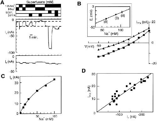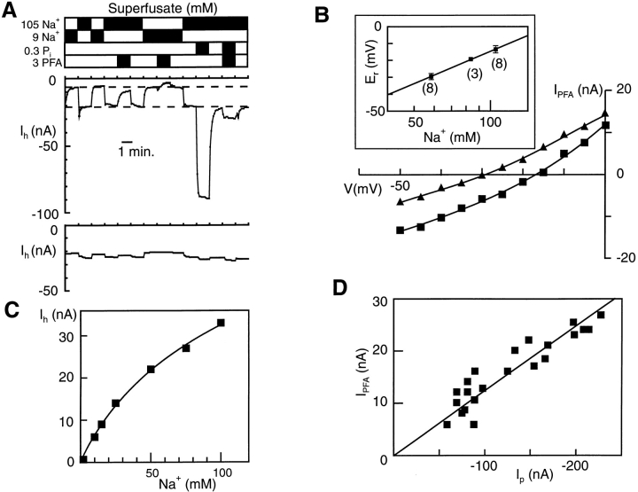 Figure 4. Characterization of Pi-independent current component using phosphonoformic acid. (A) Oocyte holding current (Ih) at Vh = −50 mV for continuous superfusion with the indicated solutions for a NaPi-2-expressing oocyte (top) and noninjected oocyte (bottom) from the same batch of oocytes and recorded during the same experimental session. Ih was sampled at 5-s intervals and the sample points have been joined by straight lines for clarity. Each superfusate combination was applied for 1 min to allow a stable baseline to be reached. Top and bottom dashed lines, superimposed on NaPi-2 data, indicate Ih at 9 and 105 mM Na+, respectively. (B) Typical I-V relations for the PFA-sensitive component at two concentrations of Na+: 109 (▪) and 59 (▴) mM. A staircase voltage protocol with 5-mV, 100-ms-long steps was applied to the oocyte. Points represent the difference between the steady state current at the end of each step under control conditions and the response in the presence of 3 mM PFA. As PFA is a trisodium salt, the control solution Na+ concentration in each case was adjusted to ensure that the Na+ gradient remained the same. Continuous lines are polynomial fits to the data, used to determine the reversal potential (Er). Inset shows Er plotted as a function of Na+ concentration. Note that Na+ concentration is plotted on a log10 scale. Number of cells is indicated for each Na+ tested. Straight line is a linear regression giving a slope 64.4 ± 1.7 mV. (C) Dose dependency with respect to Na+ for Ih in the absence of Pi at Vh = −50 mV. Data shown for a typical cell expressing NaPi-2. Each point represents the induced change in steady state current, relative to 0 mM Na+. Continuous curve is the fit using Eq. 1, giving Km = 128 mM, Ihmax = 74 nA, and n = 0.92. (D) The PFA-sensitive current correlates with the Pi-induced current. Data shown for 22 cells from several donor frogs displaying different levels of expression of NaPi-2. For each cell, the Pi-induced current (Ip) at 1 mM Pi was determined together with the PFA-sensitive component (IPFA) for 3 mM PFA at Vh = −50 mV. The straight line is a linear regression line forced through the origin with a slope: 0.126 ± 0.004.