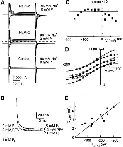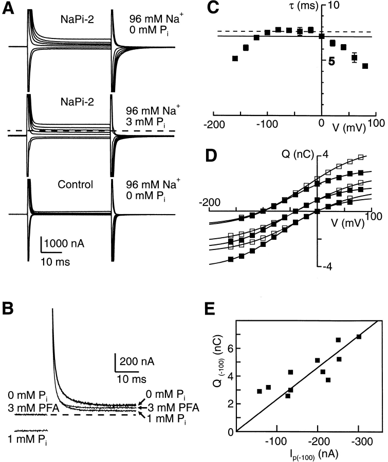 Figure 5. Pre–steady state relaxations induced by voltage steps applied to oocytes expressing NaPi-2. (A) Family of current records in response to voltage steps from Vh = −100 to −140, −120, −80, −40, 0, +40, and +80 mV, and returning to Vh after 40 ms. (top) Superfusion with 96 mM Na+, 0 mM Pi. The endogenous capacitive charging transients of the oocyte have been clipped due to the high voltage clamp gain used. (middle) Superfusion with 96 mM Na+, 3 mM Pi. Dashed line, corresponding to the holding current level at −100 mV in the absence of Pi, is superimposed to indicate the change in steady state current induced by Pi (at −100 mV, Ip ≈ 250 nA). (bottom) Superfusion with 96 mM Na+, 0 mM Pi for a noninjected oocyte from the same batch. Each record is the average of eight successive raw sweeps. Filtering at 3 kHz, sampling 50 μs/point. (B) Effect of PFA pre–steady state currents. Records in response to a voltage step from −100 to 0 mV for superfusion in the presence of 0.3 mM Pi or 3 mM PFA compared with the response for 96 mM Na+ alone, as indicated. Dashed line indicates baseline for control condition. Each record is the average of eight successive raw sweeps and has been blanked for 2 ms during the capacitive charging transient. Filtering at 3 kHz, sampling 50 μs/point. (C) Voltage dependency of the main time constant (τ) obtained from biexponential fit to records such as in A for holding potentials (Vh) −100, −40, and 0 mV for the same cell. Filled symbols are mean ± SEM of the ON transition τs at the three Vh. The straight lines represent the mean of the OFF relaxation τs over the whole voltage range: (dotted line) Vh = −100 mV, (dashed line) Vh = 0 mV. The mean OFF τs are: 7.5 ± 0.06 ms (Vh = −100 mV); 7.6 ± 0.05 ms (Vh = −40 mV), and 7.13 ± 0.14 ms (Vh = 0 mV). (D) Voltage dependency of charge movement (Q) associated with NaPi-2-related component at different Vh for the same cell as in B. (▪) ON, (□) OFF. Continuous lines are fits of the Boltzmann function (Eq. 2) to the data. See Table I for fit parameters. (E) Correlation between estimated charge available for translocation at −100 mV (Q(−100)) and Pi-induced current at −100 mV (Ip(−100)) with 96 mM Na+ and 1 mM Pi. Data points are from 11 cells from different oocyte batches. Q(−100) was obtained by fitting the Boltzmann function (Eq. 2) to the Q-V data and Ip(−100) was obtained from steady state response of same cell under same recording conditions. Straight line is a linear regression line with slope 46 s−1 and forced to intercept the origin.
