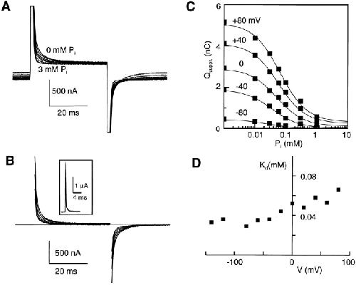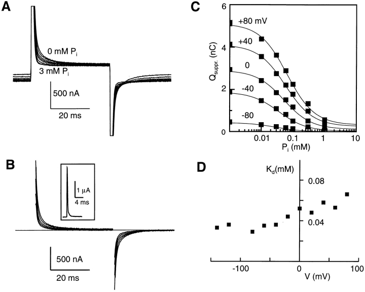 Figure 7. The effect of changing external Pi on pre–steady state relaxations. (A) Pre–steady state relaxations recorded from a cell expressing NaPi-2 for a voltage jump from −100 to 0 mV for 0, 0.01, 0.03, 0.06, 0.1, 0.3, 1, and 3.0 mM Pi. The initial baseline shift reflects the steady state holding current induced by each Pi. Pi was applied in increasing concentration. Between successive applications, the cell was allowed to recover in 0 mM Pi until the initial steady state holding current at −50 mV was reestablished. (B) The Pi-suppressed current obtained by subtracting the record at 3 mM Pi from the test record under the same voltage step conditions as A and same cell. Each trace has been baseline-adjusted to the steady state value. The first millisecond of each difference record during the voltage transition was blanked. This corresponds to the time to complete most of the oocyte capacitive charging as indicated in the inset for a voltage jump from −50 to −40 mV, plotted on the same time scale (same cell). (C) Pi dose response for the same cell showing amount of apparent charge suppressed (Qsuppr.) at −100 mV as a function of Pi for five target potentials as indicated. Charge was estimated by numerical integration of the records as in B, with the steady state holding current suppressed. A small error is expected in Qsuppr. due to starting the integration at 1 ms. Continuous lines show fits with Eq. 1 for n = −1. (D) Voltage dependence of apparent Kd for suppression of pre–steady state charge found from fitting Eq. 1 to the data, for the same cell as in C.