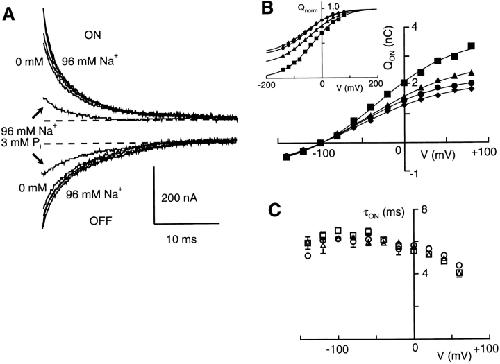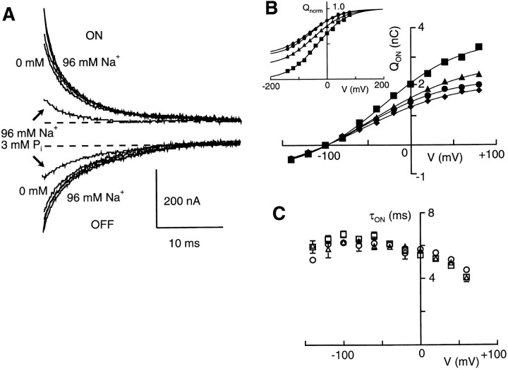 Figure 6. The effect of changing external Na+ on pre–steady state relaxations. (A) Typical response to a voltage step from −100 to 0 mV for a cell expressing NaPi-2 (Ip = −120 nA at −50 mV, 3 mM Pi). The cell was superfused with 96, 50, 25, and 0 mM Na+ and sufficient time was allowed between changing superfusate to establish a steady holding current before making pre–steady state recordings. The pre–steady state response to superfusion with 96 mM Na+ and 3 mM Pi is also shown. For superfusion with 0 mM Na+ and 3 mM Pi, the response was the same as for 0 mM Na+ alone (data not shown). All traces were blanked for the first 2 ms after the step and adjusted to give the same steady state baseline. (B) Steady state charge distribution under varying Na+. The Q-V data (ON transition) for a typical cell with superfusion with 96 (▪), 50 (▴), 25 (•), and 10 (♦) mM Na+. Continuous lines were obtained by fitting the Boltzmann function (Eq. 2) to the data. Inset shows the same data normalized to the predicted maximum charge and offset to superimpose at the depolarizing limit to indicate the shift in V0.5. (C) τ-V data pooled (n = 4) showing main ON relaxation time constant determined for superfusion with 96 (□), 50 (▵), and 25 (○) mM Na+.