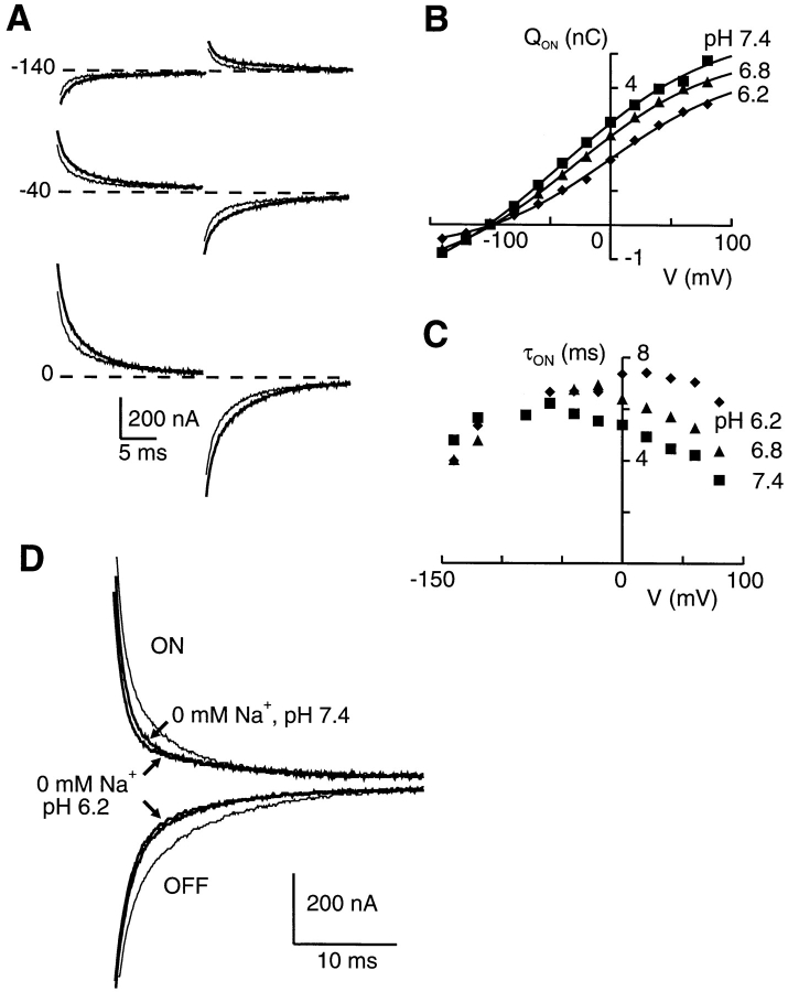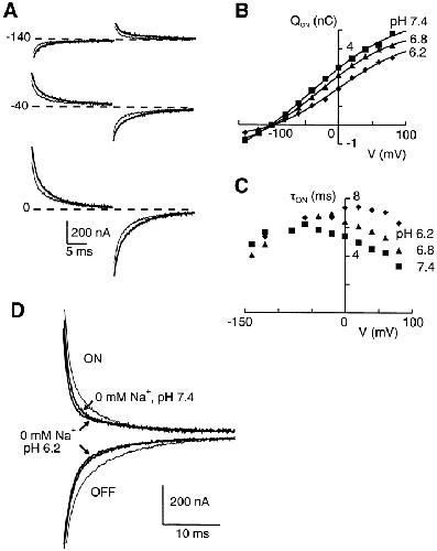 Figure 8. The effect of external pH on pre–steady state relaxations. (A) Superimposed pre–steady state relaxations for ON and OFF voltage steps to the test potentials indicated from a holding potential of −100 mV for the same cell with 96 mM Na+ in external medium. Thick traces, pH 7.4; thin traces, pH 6.2. To suppress the endogenous capacitive transient, the records were blanked for the first 3 ms after the transition. (B) Apparent charge movement for three pHs indicated in the presence of 96 mM Na+. Continuous lines are fits using the Boltzmann function (Eq. 2). The fit parameters were: (pH 7.4) z = 0.38, V0.5 = −40 mV, Qmax = 7.4 nC; (pH 6.8) z = 0.37, V0.5 = −23 mV, Qmax = 7.5 nC; (pH 6.2) z = 0.46, V0.5 = −2 mV, Qmax = 5.3 nC. (C) Voltage dependence of main ON relaxation τ for three pHs indicated and the same cell as in B. (D) Pre–steady state relaxations recorded from another cell for a step from −100 to 0 mV (ON) and returning to −100 mV (OFF) for three superfusion conditions: 96 mM Na+, pH 7.4 (thin trace); 0 mM Na+, pH 7.4, and 0 mM Na+, pH 6.2 (arrows). The graphical superposition of the traces reveals that after removal of Na+ from the external medium, a reduction in pH leads to a further suppression of the relaxations. To suppress the endogenous capacitive transient, the records are blanked for the first 3 ms after the transition.