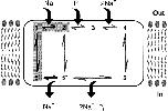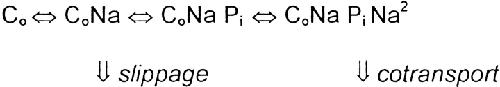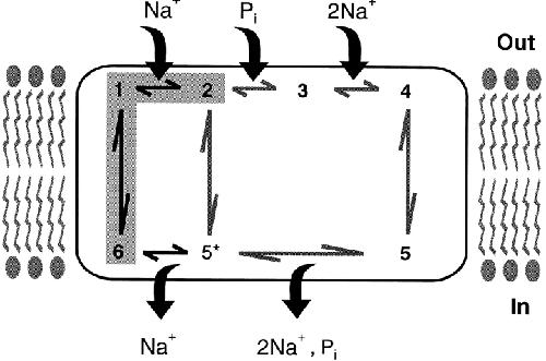 Figure 9. A state diagram representation of an ordered binding model for NaPi-2. Voltage-dependent partial reactions identified by pre–steady state experiments (translocation of the unloaded carrier, 6 ⇔ 1; binding of the first Na+, 1 ⇔ 2) are shown shaded. The empty cotransporter is assumed to have a valency of −1, but this charge translocates through a fraction of the transmembrane field to account for an apparent valency <1 derived from fits using Eq. 2. Both the slippage (2 ⇔ 5*) pathway and translocation of the fully loaded carrier (4 ⇔ 5) are assumed to be electroneutral. Depending on the availability of substrate and membrane potential, accessibility to the substrate binding sites favors either the cis (states 1, 2, 3, 4) or trans (states 5, 5*, 6) side of the membrane. Under normal physiological conditions with V < 0, the apparent transport cycle proceeds clockwise around the loop. For V < 0, and low internal Na+, external Na+ binding is facilitated on the cis side due to the outward translocation of −ve charge associated with transition 6 ⇔ 1. This allows one Na+ ion to move to its binding site within the transmembrane field, leading to an increasing of the affinity of the transporter for Pi (assumed to be predominantly divalent at neutral pH), which then binds (2 ⇔ 3) in a voltage-independent manner. Then follows a further voltage-independent step involving the binding of two Na+ ions (3 ⇔ 4) to give electroneutrality. The fully loaded carrier is now able to translocate (4 ⇔ 5), release substrates on the trans side, and return to state 6. A net inward charge movement of +1 electronic units occurs per cycle, which is manifested as Ip. Except for slippage, the order of binding/release of substrates on the cytosolic side cannot be determined using the intact oocyte preparation and, therefore, the cytosolic release of cotransported Pi, together with two Na+ ions, is lumped as one reaction (5 ⇔ 5*).