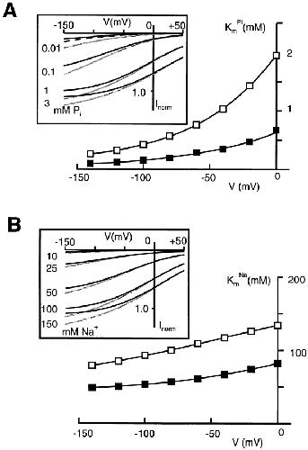 Figure 11. Simulations of Pi-induced currents in the steady state, assuming zero trans conditions. Since the transition 6 ⇔ 1 is the only translocation step involving net charge movement, the steady state current is proportional to X1k16 − X6k61, where X1 and X6 are the occupancy of states 1 and 6, respectively. Voltage-dependent rate constants and parameters are given in Fig. 10. Additional rate constants for the kinetic scheme of Fig. 9 are (s−1): k23 = 1,000 [Pi], k32 = 100, k34 = 500 [Na]2, k43 = 50, k45 = k54 = 25, k55* = 10,000, k5*5 = 0, k5*6 = 10,000, k65* = 0, k25* = 2.5, k5*2 = 2.5, where [Pi] and [Na] are the concentrations of Pi and Na+, respectively (Molar). These were chosen to give reasonable predictions of the experimentally observed I-V relations. (A) Pi dose response. Inset shows a set of I-V curves for nominal Pi values indicated, normalized to Ip at −100 mV. Dashed curve is the slippage component (simulated with Pi = 0 mM), light curves represent the total simulated Pi-induced steady state current and bold curves represent the steady state response with slippage component subtracted (equivalent to the Pi-induced response measured). Eq. 1 was fit to the data to obtain the apparent KmPi as a function of V for nominal 100 (▪) and 50 (□) mM Na+. The continuous lines are for visualization only. (B) Na+ dose response. (inset) Set of I-V curves for nominal Na+ values indicated, and 1 mM nominal Pi, normalized to Ip at −100 mV. Light curves represent the simulated total steady state current, bold curves have slippage component subtracted (equivalent to the Pi-induced response measured). Eq. 1 was fit to the data to derive the apparent KmNa as a function of V for nominal 1 (▪) and 0.1 (□) mM Pi. The continuous lines are for visualization only.