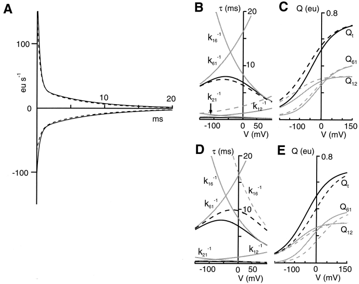 Figure 10. Simulations predict voltage-dependent behavior of pre–steady state kinetics in the absence of external Pi. Values were assigned to the parameters associated with voltage-dependent partial reactions (shown shaded in Fig. 9: unloaded carrier, 6 ⇔ 1; first Na+ binding/debinding, 1 ⇔ 2) to give a reasonable match to the measured τ-V and Q-V data under varying external Na+. (A) Simulations of pre–steady state current showing the ON and OFF relaxations for a step from −100 to 0 mV for two external Na+ concentrations (continuous lines, 100 mM; broken lines, 50 mM). The voltage step is assumed to occur instantaneously so that no account is taken of the speed of oocyte membrane charging. Note that because of the voltage dependence of k21, the fast component in the relaxation appears more prominent in the ON than OFF traces for both Na+, and this can lead to significant errors in estimating QON and QOFF (see discussion). Rate constants for voltage dependent steps are (s−1): k61 = 60 exp(−0.16 eV/kT), k16 = 120 exp(0.24 eV/kT), k12 = 8,000 [Na] exp(−0.15 eV/ kT), k21 = 2,000 exp(0.15 eV/kT), where [Na] = Na+ concentration (Molar). The corresponding valences and asymmetry factors are: z61 = 0.4, z12 = 0.5, δ61 = 0.4, δ12 = 0.5. Ordinate scale is in electronic units (eu) s−1, where 1 eu = 1.602 × 10−19 C. (B) Simulated τ-V relations for two external Na+ concentrations as in A. Bold curves represent the two nonzero time constants predicted from the eigenvalue solutions of the three-state model involving transitions 6 ⇔ 1 and 1 ⇔ 2 (continuous curves, 100 mM; broken curves, 50 mM). The faster component with τ < 1 ms would not be detected easily by curve fitting due to the oocyte charging transient. Light curves represent the voltage dependence of the reciprocal rate constants for the transitions indicated by the respective subscripts. Note that only k12 is dependent on Na+. (C) Simulated steady state Q-V relation for the same two Na+ concentrations. The amount of charge in electronic units contributed by the two transitions is shown (Q61, Q12), together with the total charge (Qt). For the simulation, the holding potential was set at −1,000 mV to obtain normalized relations. Fitting Eq. 2 to the Qt-V data predicted z = 0.5 and a shift of −16 mV for a change in Na+ from 100 to 50 mM. (D) Simulation of the effect of pH on pre–steady state kinetics. The unloaded carrier backward rate constant (K16) is assumed to be decreased from 120 to 60 s−1, resulting from an increase in external H+ as indicated by measurements. The τ-V curves predict an increase of the slower relaxation for V > 0. Continuous lines represent τs (bold) and inverse rate constants (light) under normal (pH 7.4) conditions. Broken lines are for reduced pH conditions. (E) The corresponding steady state Q-V relations for the same change in rate constant K16 showing the shift in the Q-V distribution towards depolarizing potentials (broken lines) resulting primarily from a shift in the steady state charge distribution of the unloaded carrier.