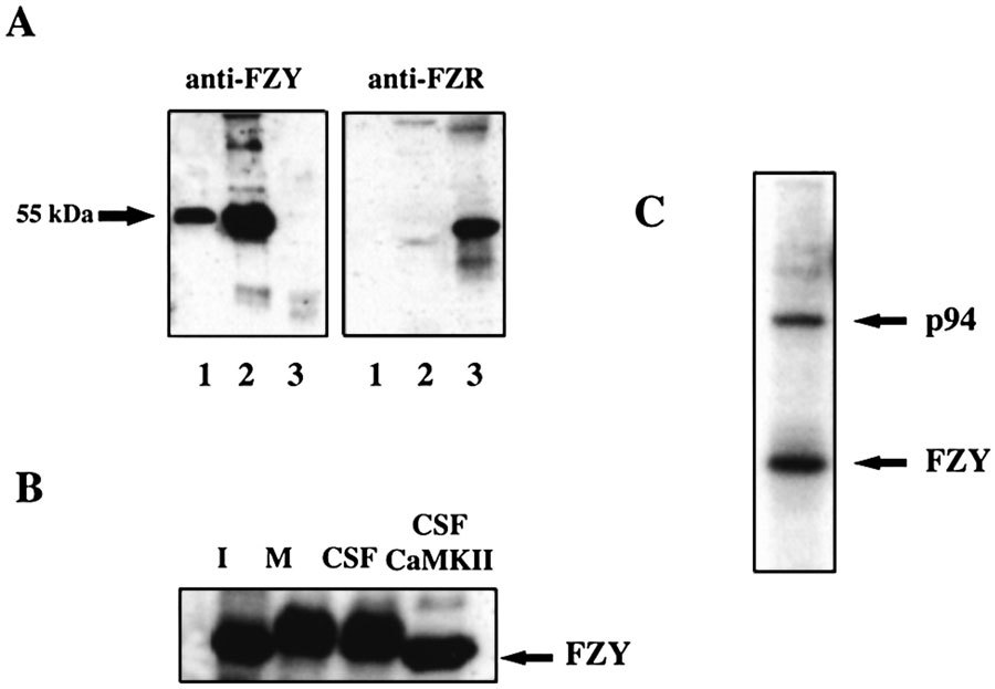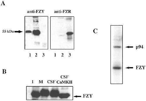 X-FZY is expressed and undergoes cell cycle-dependent phosphorylation during the first mitotic Xenopus cell cycle. (A) X-FZY is detected by Western blotting in extracts prepared from unfertilized eggs, whereas X-FZR is not detected. Lane 1, extract prepared from a CSF extract (75 μg of proteins); lane 2, reticulocyte lysate (2 μl) programmed with X-FZY (estimated amount of 35S-labelled X-FZY: 0.4 pmol); lane 3, reticulocyte lysate (2 μl) programmed with X-FZR (estimated amount of 35S-labelled X-FZR: 0.2 pmol). The left blot was probed with affinity-purified antibodies directed against X-FZY, the right blot with affinity-purified antibodies directed against X-FZR. (B) Analysis by Western blotting of the changes in the electrophoretic mobility of X-FZY during the cell cycle. I, interphase extract (prepared 40 min after parthenogenetic activation); M, the same interphase extract after incubation for 15 min with highly purified starfish cyclin B–cdc2 kinase (1 μl into 20 μl; volume-specific activity: 200 pmol P transferred to H1 histone/min/μl); CSF, CSF extract; CSF +CaMKII, the same CSF extract after 45 min incubation with in vitro translated, constitutively active CaMKII (2 μl reticulocyte lysate into 20 μl CSF extracts). (C) 32P-incorporation into X-FZY and co-immunoprecipitated proteins after incubation of an interphase extract with highly purified starfish cyclin B–cdc2 kinase. The same experiment as in (B), but [γ-32P]ATP (50 μCi) was added simultaneously with the kinase. FZY and co-immunoprecipitated proteins were analysed by autoradiography after immunoprecipitation with affinity-purified FZY antibodies.