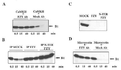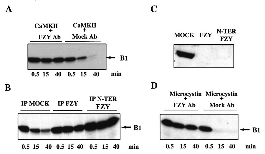 Antibodies directed against Xenopus FZY (FZYAb) suppress degradation of 35S-labelled cyclin B1 triggered by CaMKII or microcystin in CSF extracts. (A and D) A CSF extract (20 μl) received either 2 μg of affinity-purified FZY antibodies or the same amount of rabbit immunoglobulins (Mock Ab), as well as 1 μl of in vitro translated 35S-labelled cyclin B1. Ten minutes later, either 2 μl of constitutively active unlabelled CaMKII, in vitro translated in reticulocyte lysate (A) or 1 μM microcystin (D) was added. Samples (3 μl) were taken 0.5, 15 and 40 min later and analysed by SDS–PAGE and autoradiography for degradation of cyclin B1. (C and D) Aliquots (40 μl) of a CSF extract were depleted with affinity-purified antibodies immobilized on protein A–Sepharose beads (FZY, antibodies against the N-terminally truncated recombinant protein; N-TER FZY, antibodies against a N-terminal peptide of FZY; see Materials and methods) or mock depleted with the same amount (10 μg) of rabbit immunoglobulins (MOCK). Supernatants (20 μl) were taken and constitutively active in vitro translated CaMKII was added (2 μl), as well as 1 μl of in vitro translated 35S-labelled cyclin B. Samples (3 μl) were taken 0, 5, 15 and 40 min later and analysed by SDS–PAGE (B). Supernatants (1 μl) were also analysed by Western blotting with affinity-purified FZY antibodies (C) to confirm depletion of the FZY protein.