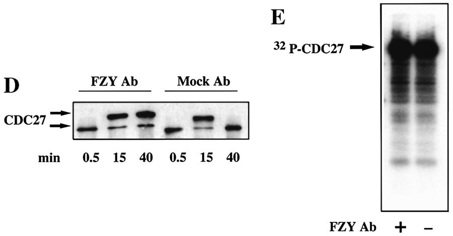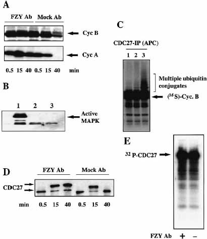 FZY antibodies suppress MPF-dependent activation of the APC/cyclosome. (A) An interphase extract (20 μl), prepared 40 min after parthenogenetic activation from Xenopus eggs, received either 2 μg of affinity-purified FZY antibodies, or the same amount of rabbit immunoglobulins (Mock Ab). After 10 min, highly purified starfish cyclin B–cdc2 kinase was added (1 μl; volumic activity: 200 pmol P/min/μl). Samples were taken 0.5, 15 and 40 min thereafter and analysed by Western blotting with an antibody directed against starfish cyclin B (upper panel) for degradation of cyclin B. The lower panel shows the same experiment, excepted that recombinant human cyclin A was added before cyclin B–cdc2 kinase addition, and samples were analysed by Western blotting with an antibody directed against human cyclin A. (B) Samples taken 30 min after cyclin B–cdc2 kinase addition in the above experiment, in the presence of affinity-purified FZY antibodies (lane 2) or mock immunoglobulins (lane 3), were run together with a CSF sample (lane 1) and analysed by Western blotting for detection of the active, phosphorylated form of MAPK. Active MAPK is detected in CSF extract only. (C) Samples, taken before (lane 1) or 20 min after addition of starfish cyclin B–cdc2 kinase in the experiment depicted in (A), and containing affinity-purified FZY antibodies (lane 2) or mock immunoglobulins (lane 3), were first depleted with protein A–Sepharose, then supernatants were immunoprecipitated with affinity-purified CDC27 antibodies. The immunoprecipitated APC/cyclosome was assayed in each condition for accumulation of ubiquitin conjugates from 35S-labelled cyclin B1 during a 15 min incubation (see Materials and methods). (D) Same experiments as (A), but the blot was probed with affinity-purified CDC27 antibodies. (E) Same experiment as in (A), using an interphase extract (20 μl) containing 2 μg of FZY antibodies (+) or 2 μg of control immunoglobulins (−), but starfish cyclin B–cdc2 kinase was added simultaneously with [γ-32P]ATP (50 μCi). After 20 min, FZY antibodies or control immunoglobulins were depleted with protein A–Sepharose beads, then the APC/cyclosome was immunoprecipitated with affinity-purified CDC27 antibodies and analysed by autoradiography after SDS–PAGE.